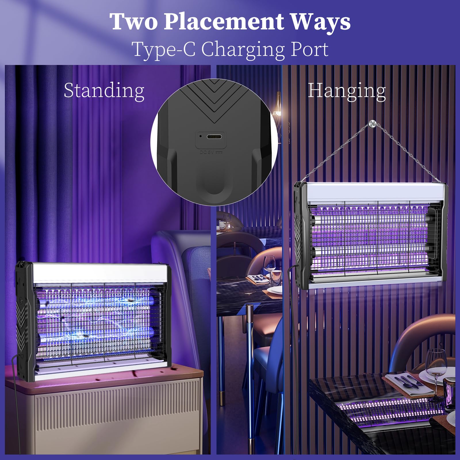 • Easy to Use: Simply plug in the USB interface and start using. On the right side of the bug zapper are the power button and USB port. Additional USB cable of the bug zapper is white, about 59in/1.5m long. Note: Please place the mosquito trap on the flat surface. If you want to hang the bug zapper on the wall, please make sure the chain has been mounted.
