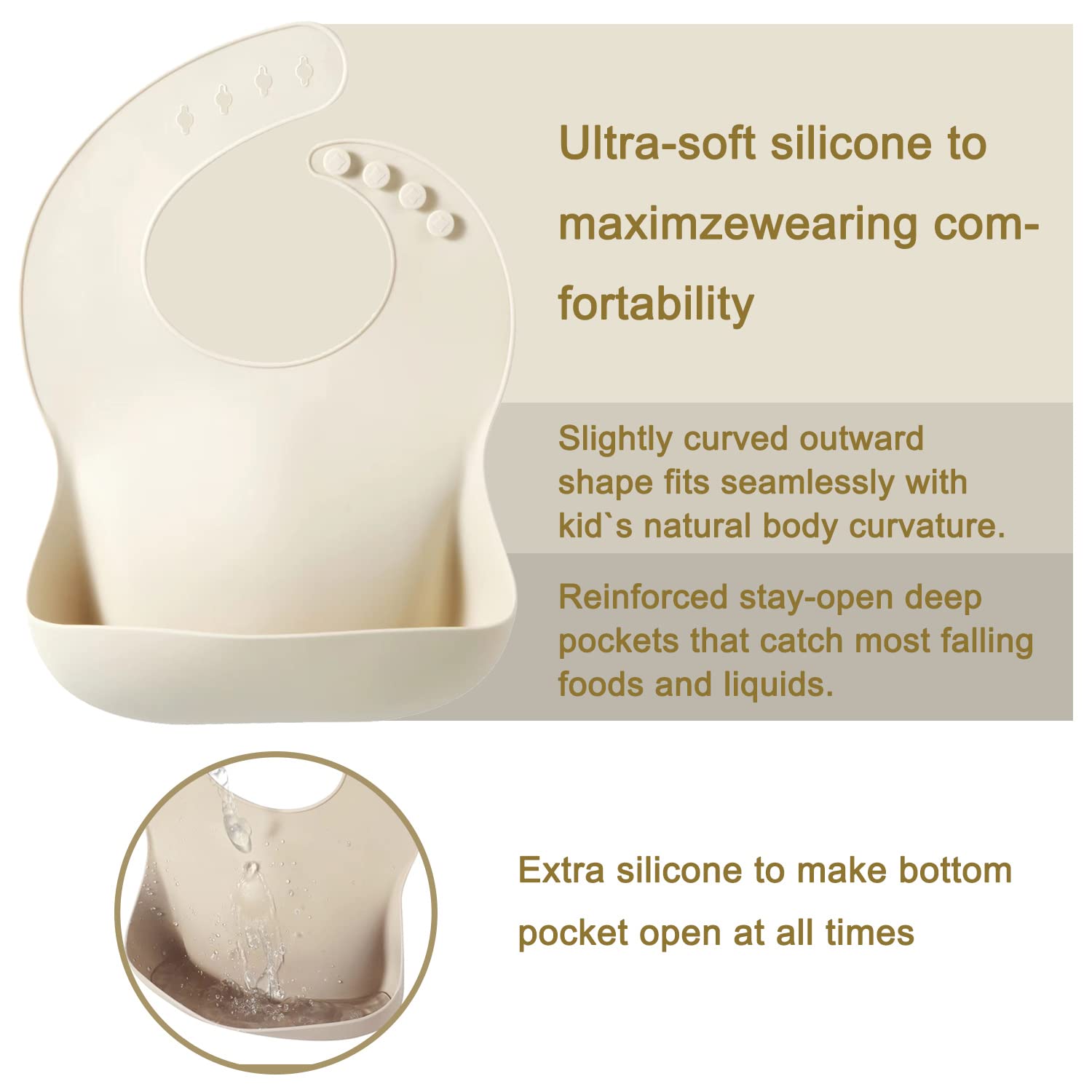 • [ STURDY POCKET ] - The silicone pocket stays open to trap crumbs and mess. Our silicone baby bibs come with a deep and sturdy spill pocket that catches any stray food or liquids, easily wipes clean baby bibs.
