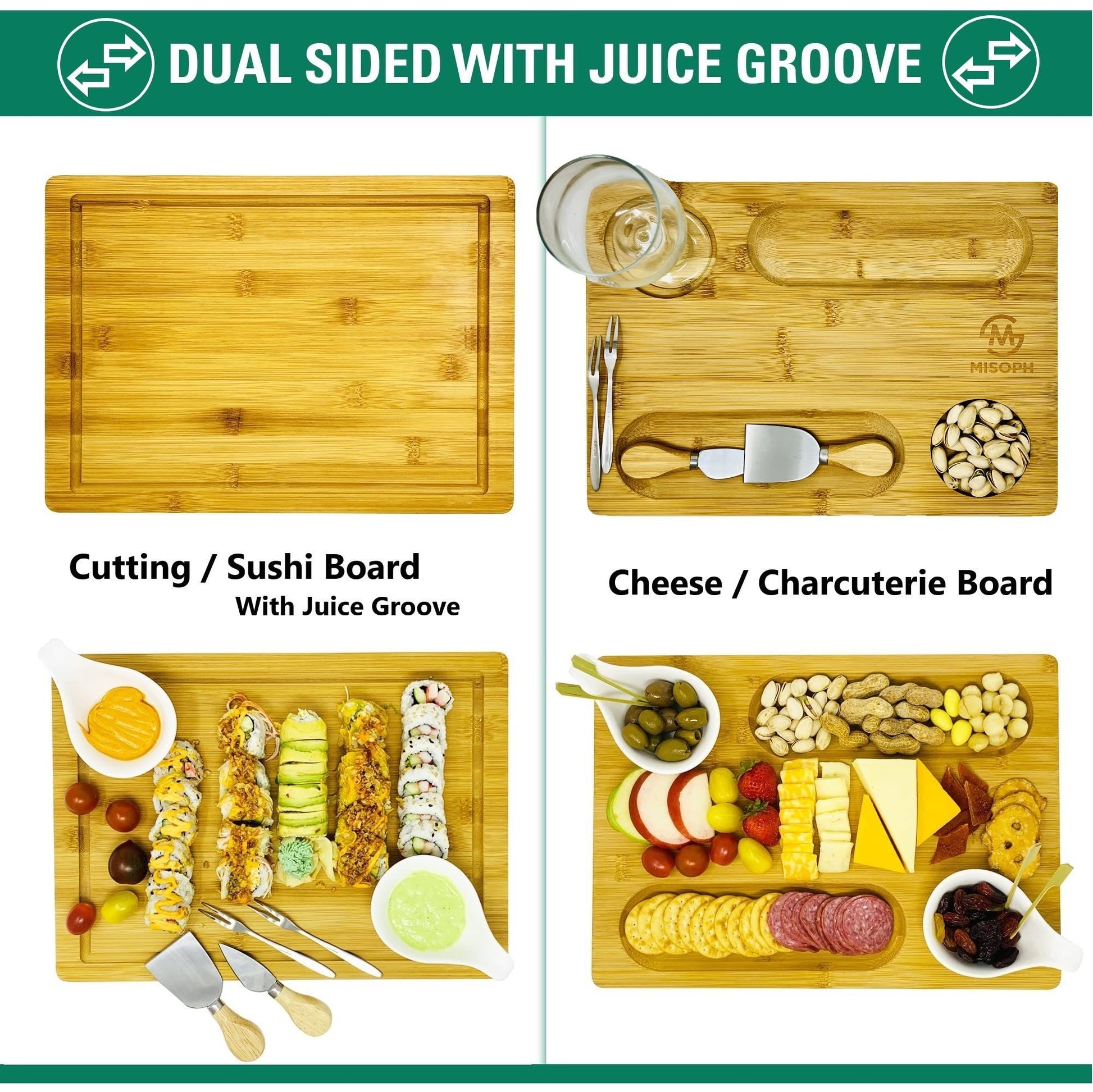 • DURABLE, CONVENIENT AND ECO-FRIENDLY: The thick bamboo wood used to make this Wood Charcuterie Platter makes it a super durable kitchen accessory that you’ll have for years. It also features side handles, reversible design and a smooth bamboo surface that is super gentle on your knives.