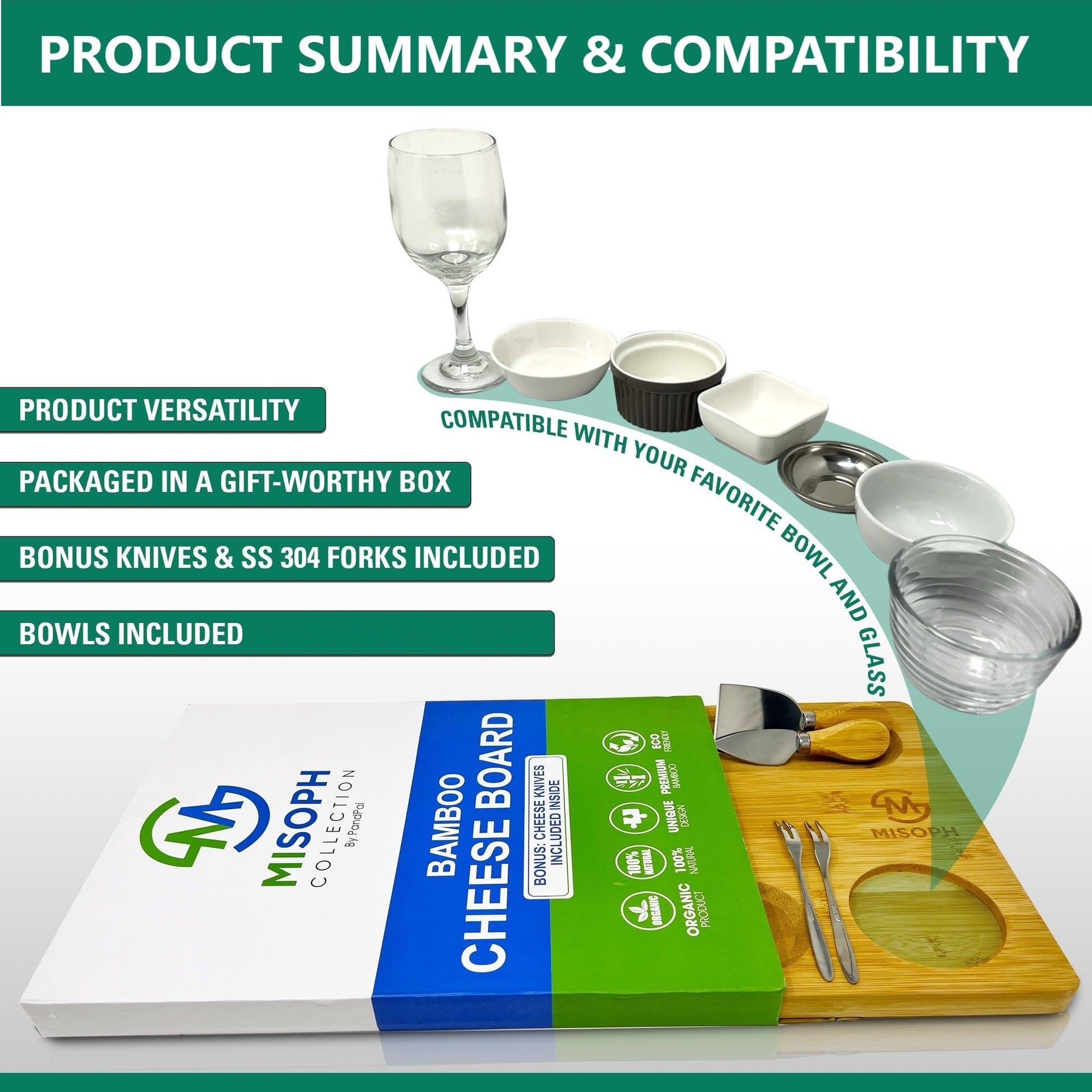 PandPal Bamboo Cheese Board with Knife, Bowl, Fork Set, Wood Charcuterie Platter & Food Serving Tray for Wine Glasses, Misoph Collection