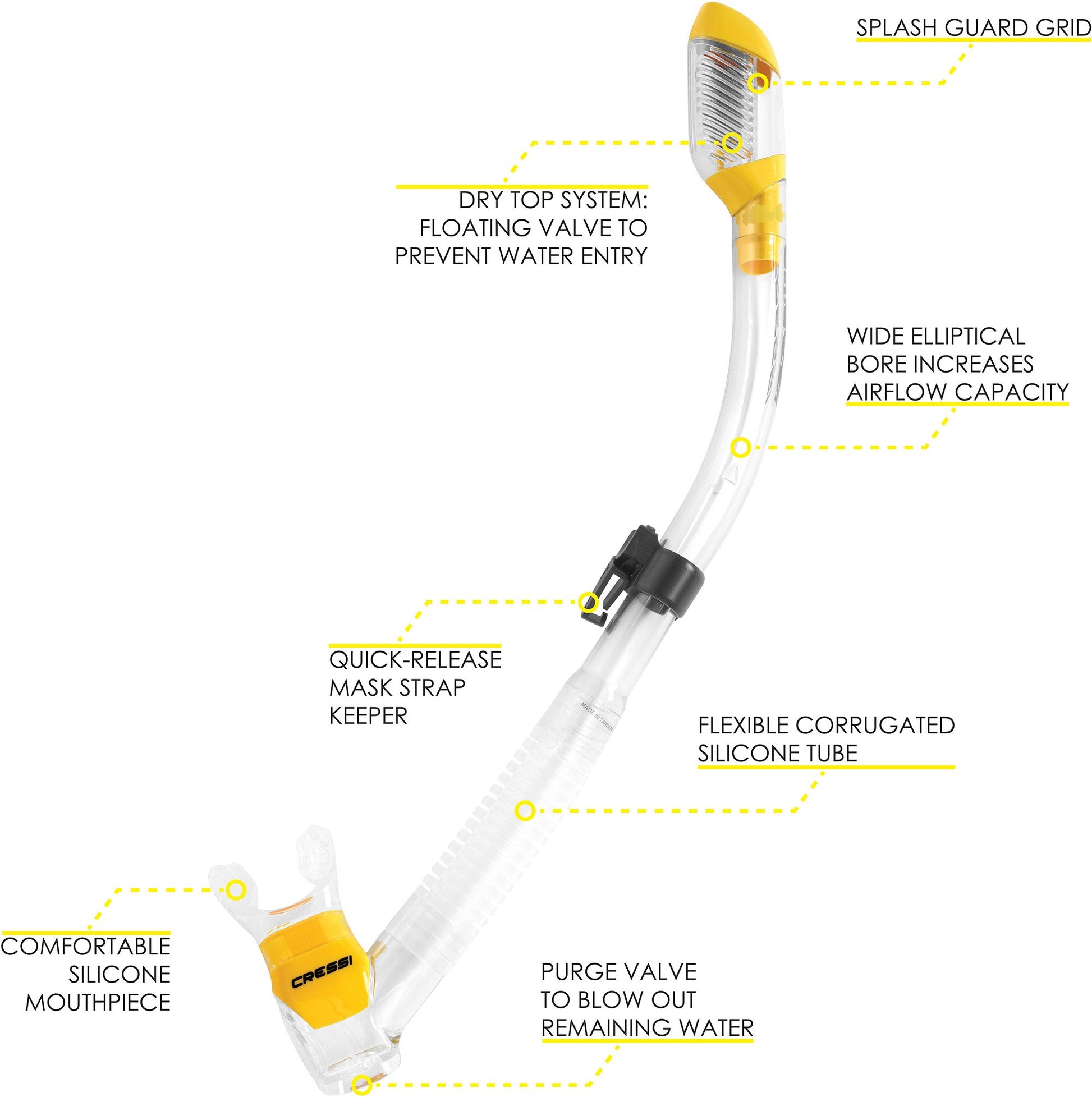 • The dry top valve eliminates water entry when submerged. A soft silicone mouthpiece reduced drastically jaw fatigue. Bottom purge valve to blow out the remaining water.