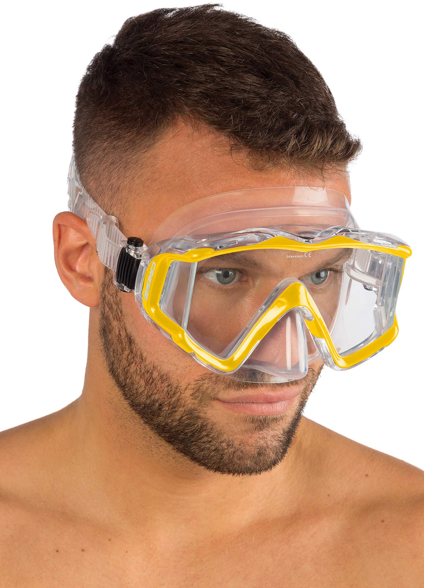 • Mask made of hypoallergenic soft silicone to ensure a perfect sealing. Soft nose pocket for easy equalization. Lenses in tempered glass for safety and easy-to-clean. Push-button buckles to easily adjust strap length.