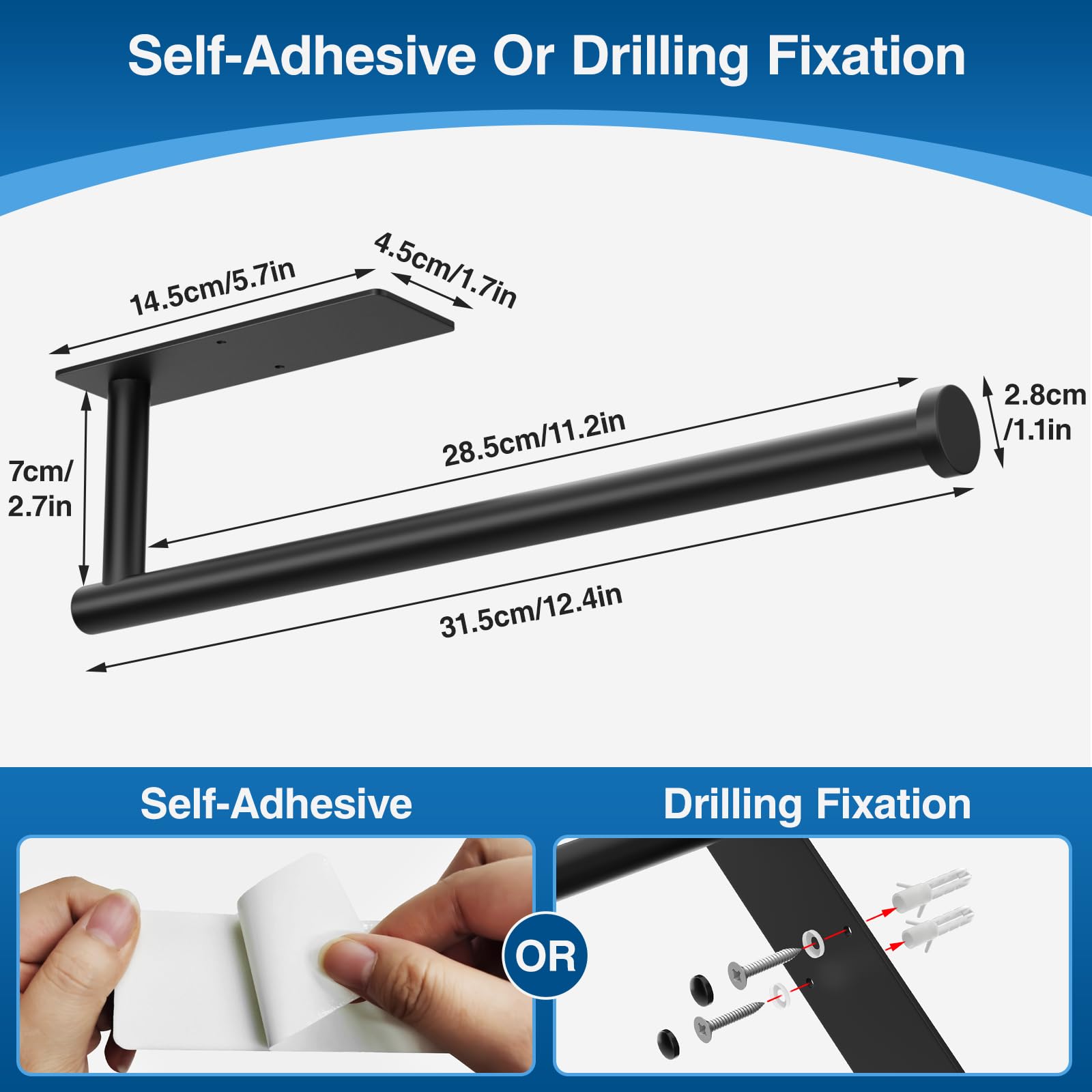 Paper Towel Holder - Self-Adhesive or Drilling, Matte Black Wall Mounted Rack - SUS304 Stainless Steel Kitchen Roll Dispenser Under Cabinet