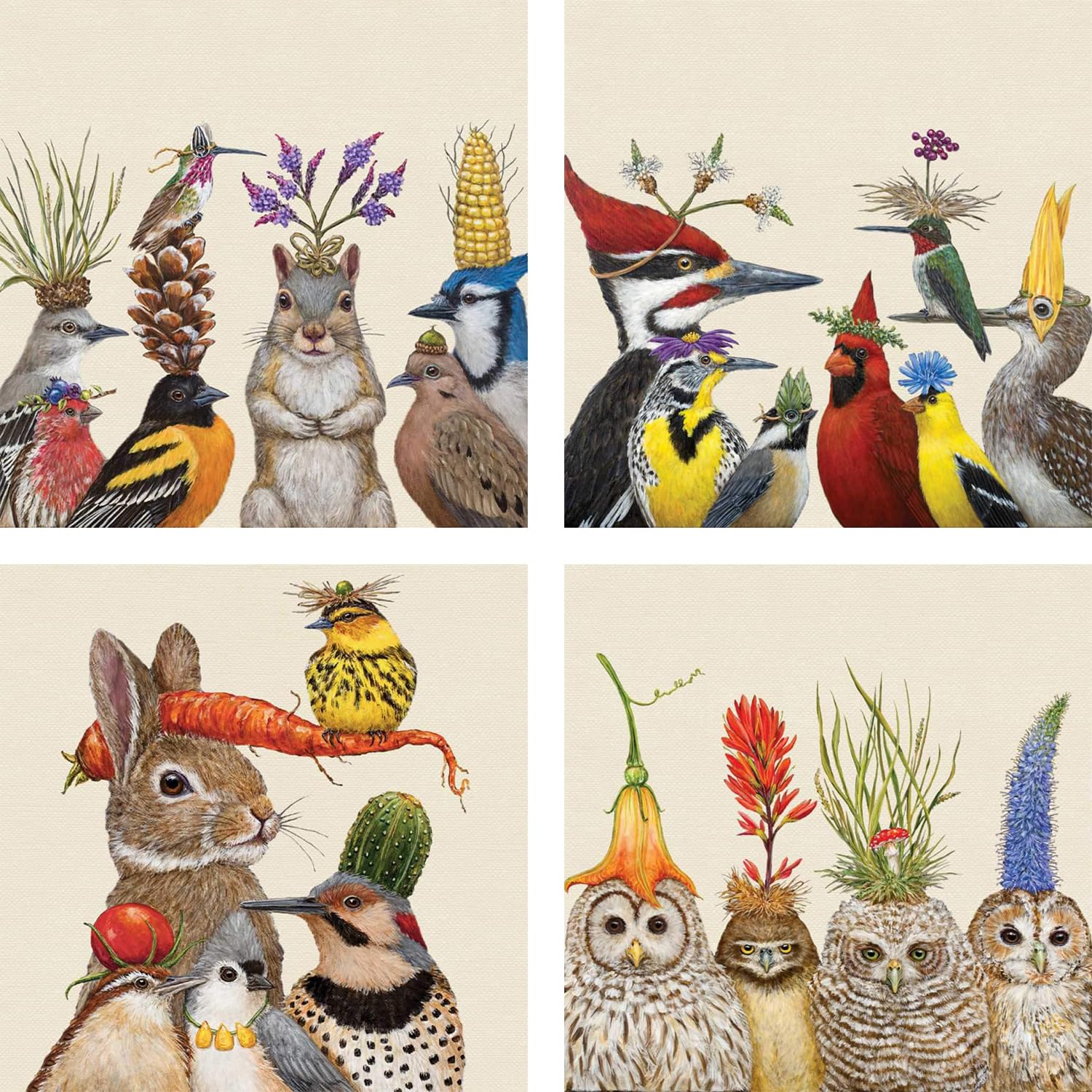 Details: Bundle of 4 packages of beverage napkins from Paperproducts Design and artist Vicky Sawyer. Forest Festivities is the theme of this bundle. Featured are napkins: Party Snacks, Big Hat Night, Harvest Party and Woody's Annual Party.Each package has 20 disposable beverage (cocktail) napkins - 5in x 5in square folded. Founded in 1993, Paperproducts Design's concept is to bring fun and fashion together on napkins, plates and accessories and to create vivid and entertaining themes. They have the largest collection of napkin and plate designs in the business.