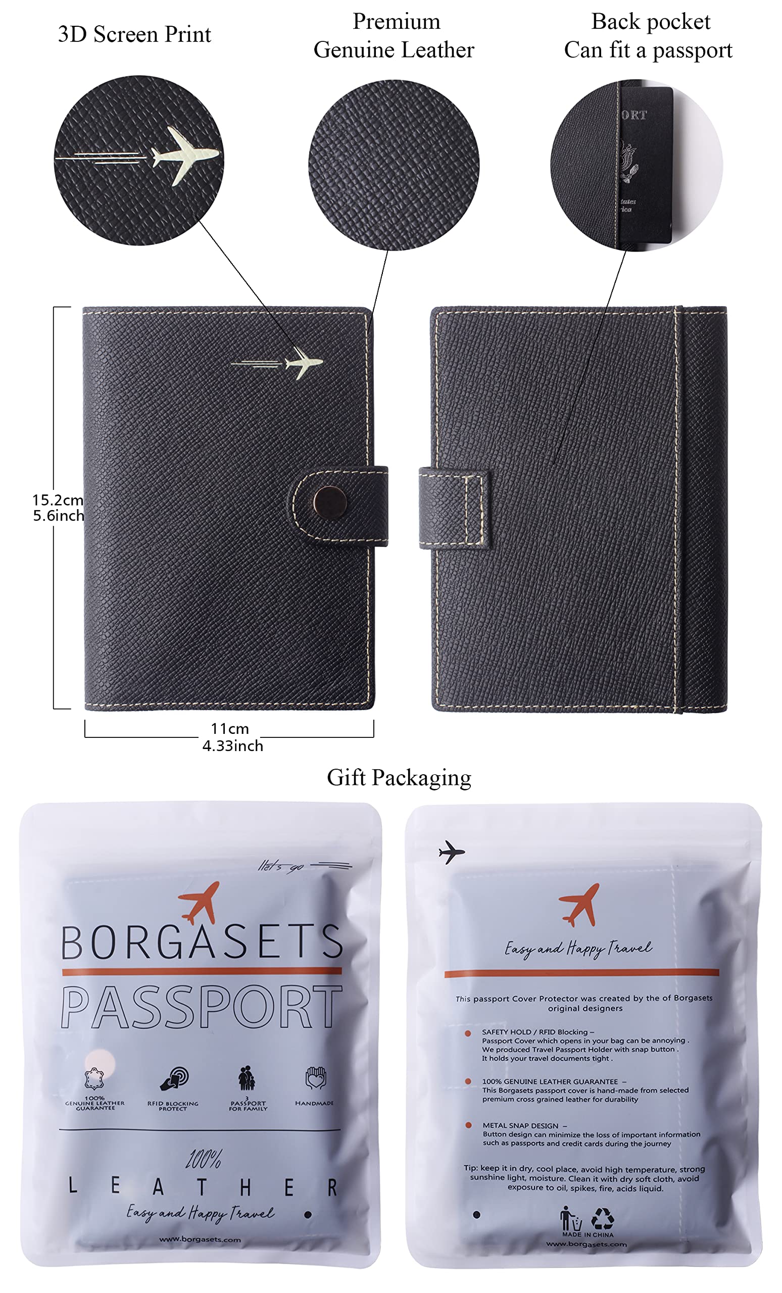 • ✅ FUNCTIONALITY – Borgasets Passport Wallet fits credit cards , cash , air tickets, passport . We produced Leather Passport Holder Keeper for men and women with pockets for credit , ID cards , money pocket . Your passport is secured with the snap button and won’t ever fall out