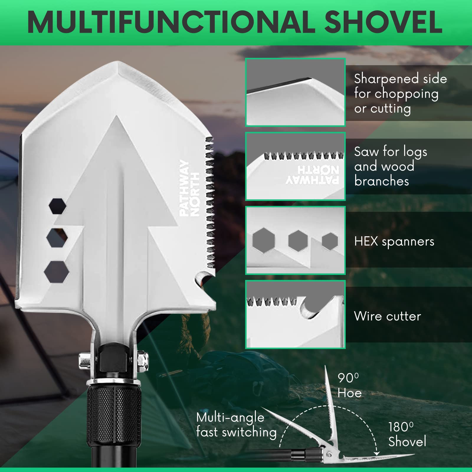 • ✓ RELIABLE ENTRENCHING TOOL – Ideal camping shovel, for clearing the ground from rocks, digging sanitation holes and more! The Pathway North off-road shovel handle is non-slip, and 2 extension bars make this e-tool easy to work. Use the serrated side of the portable shovel for sawing through tough terrain like roots, vines, or branches.