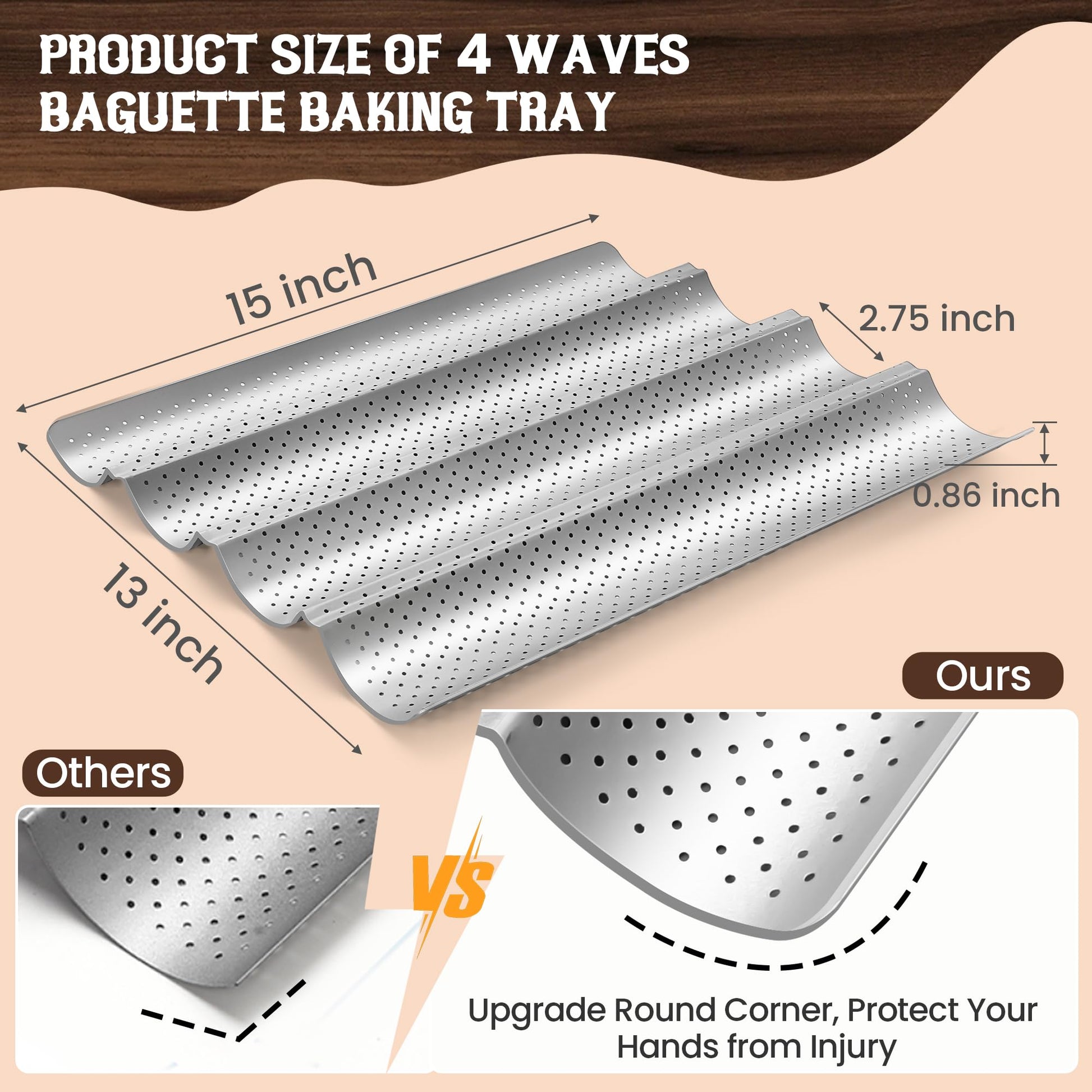 • 【FOOD-GRADE NON-STICK COATING】Pavsrmy 4-wave french bread baking pan measures 15' x 13' and fits for large home ovens ≥1.2 cu ft (35 L). Crafted with a BPA-free non-stick coating, it ensures easy release and effortless cleanup. For optimal performance, hand wash is recommended. Apply a thin layer of butter on the italian bread loaf pan before first use and wipe dry with a cloth for enhanced results. (Not Dishwasher Safe)
