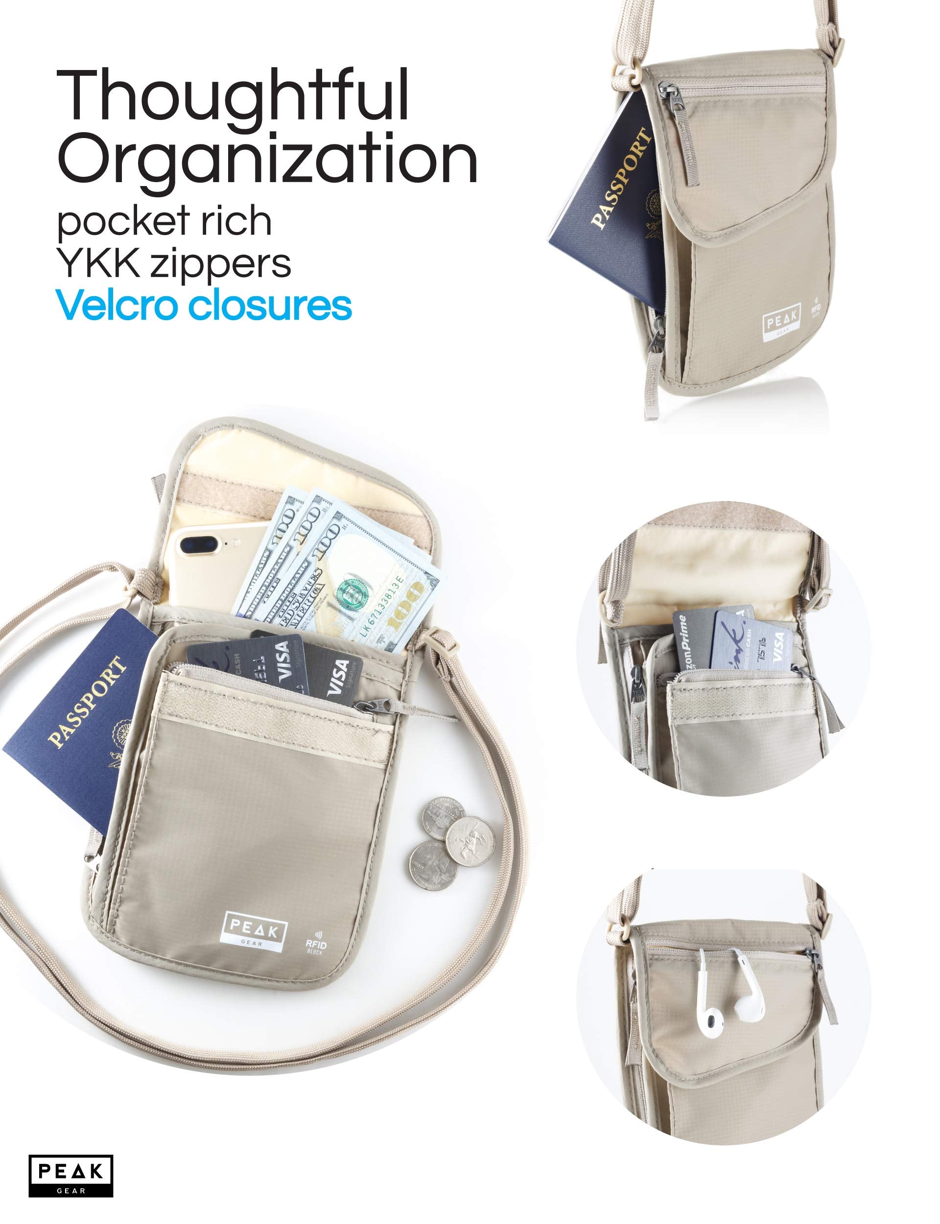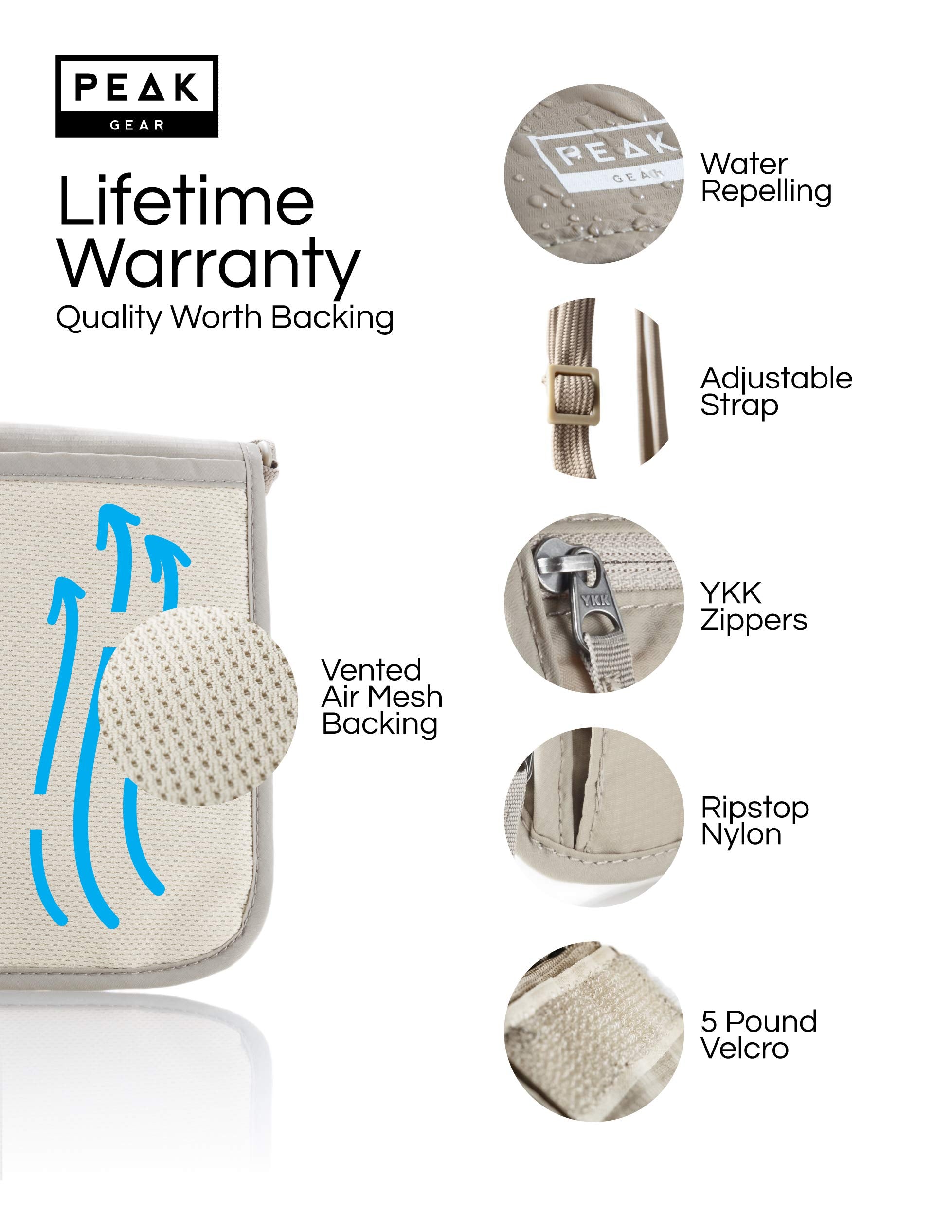• THE ORIGINAL NECK WALLET COMPANY - Since 2015, Peak Gear has helped over 190,000 people in 70+ countries ADVENTURE BETTER. This small RFID blocking carrier is designed with the HIGHEST QUALITY MATERIALS. Made with DURABLE, WATER-REPELLING, RIPSTOP NYLON, smooth, JAM-FREE YKK ZIPPERS, PREMIUM HAND STITCHING & TOUGH VELCRO, the Peak Gear travel pouch is versatile & LIGHTWEIGHT.