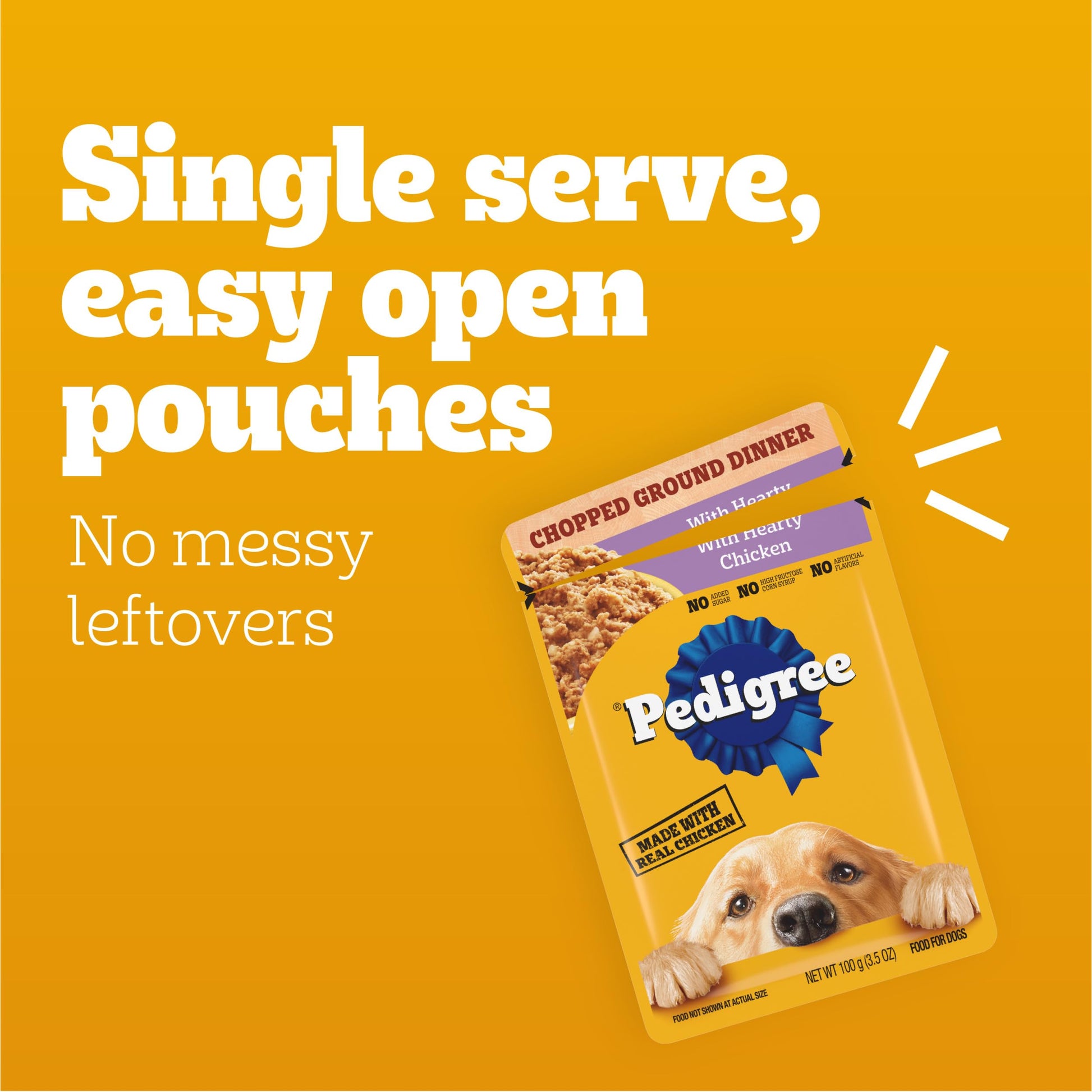 Details: Dogs bring out the good in us. Pedigree brings out the good in them. Express your love for your dog by serving Pedigree Chopped Ground Dinner Dog Food 30-Count Variety Pack. These great-tasting wet dog food recipes are 100% complete and balanced For Adult Dogs and are made with real beef or real chicken, bringing a filling and familiar flavor to mealtime. Pedigree Chopped Ground Dinner Dog Food 30-Count Variety Pack features three delicious options: With Hearty Chicken, Beef, Bacon, and Cheese Flavors, and Bacon and Filet Mignon Flavors, so your dog can have favorites to choose from. This versatile soft dog food can be served as a topper, mixed with dry dog food, or enjoyed by itself as a complete meal For Adult Dogs, bringing your dog a variety of ways to indulge. Crafted with no high fructose corn syrup, artificial flavors, or added sugars, Pedigree Chopped Ground Dinner Dog Food 30-Count Variety Pack shows your dog that you care and want them to have great tasting food.