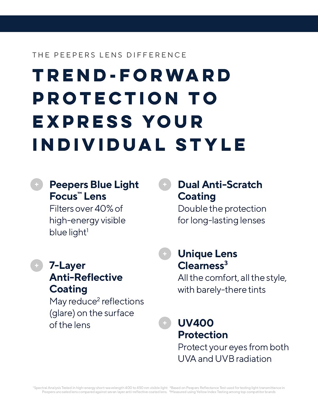 • PEEPERS BLUE LIGHT FOCUS LENSES - enhance your ability to live and work in the digital world. By filtering high-energy visible blue light, our baked-in technology works to prevent symptoms of digital eye strain*, help reduce the chance of headaches, and help alleviate tired eyes. It’s trend-forward protection to express your individual style.