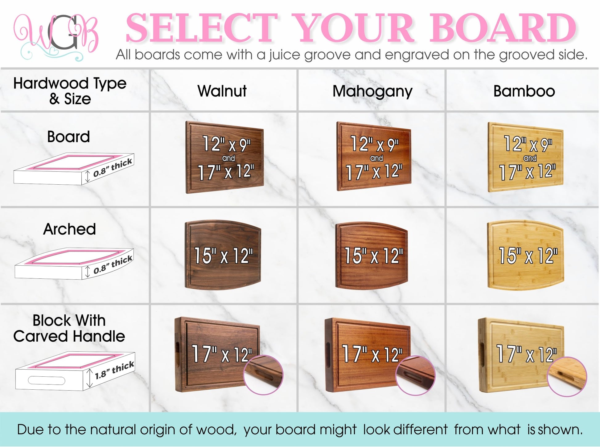 • Made With Love: Our customizable boards from Wedding Gift Boutique come in various sizes and wood colors. They are produced by a small, family-owned business, renowned for their quality and style, distinguishing them from other custom cutting boards.