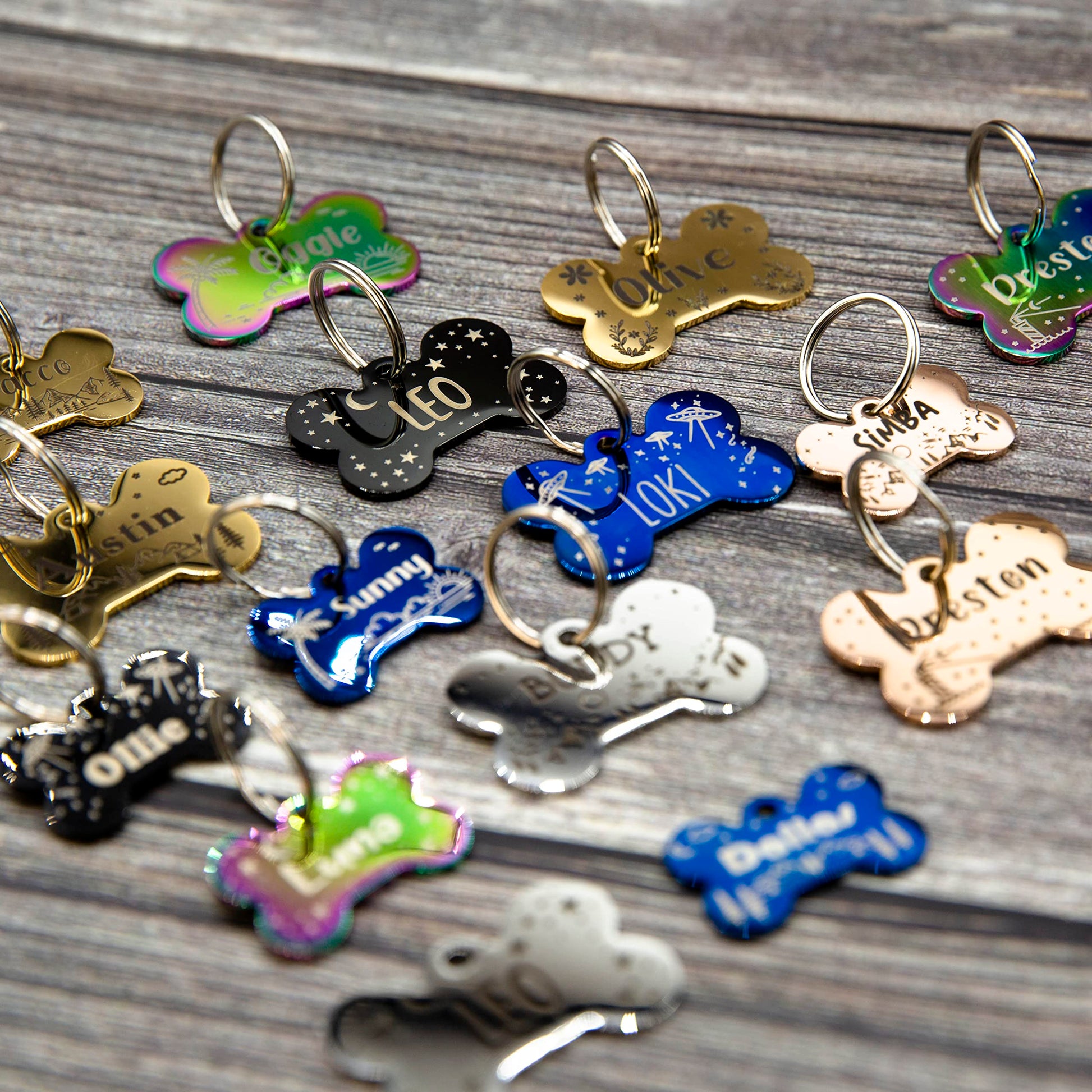• Our engraved dog cat tags personalized solid stainless steel have color plating in Gold, Rose Gold, Blue, Black, Nebula are incredibly durable and long-lasting.