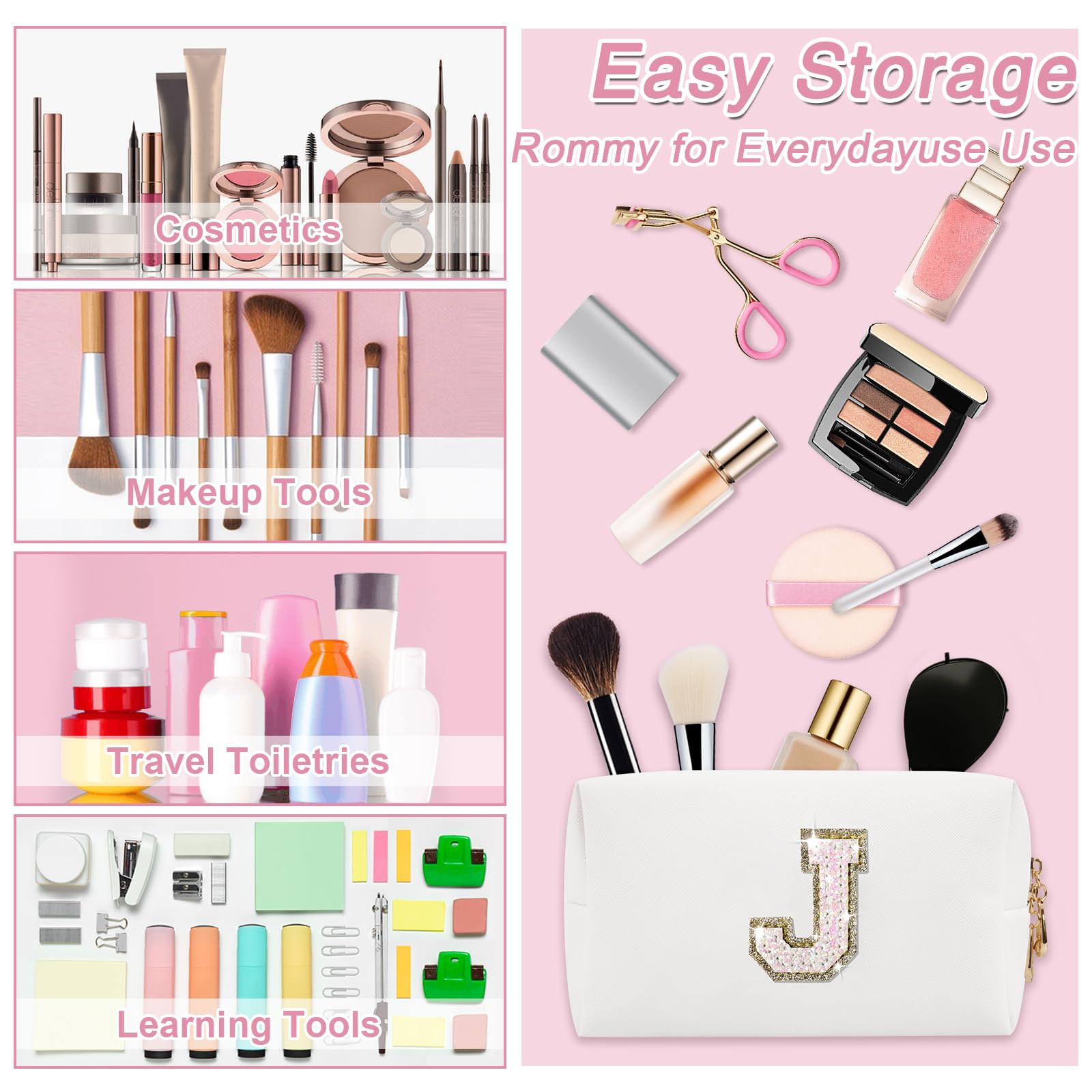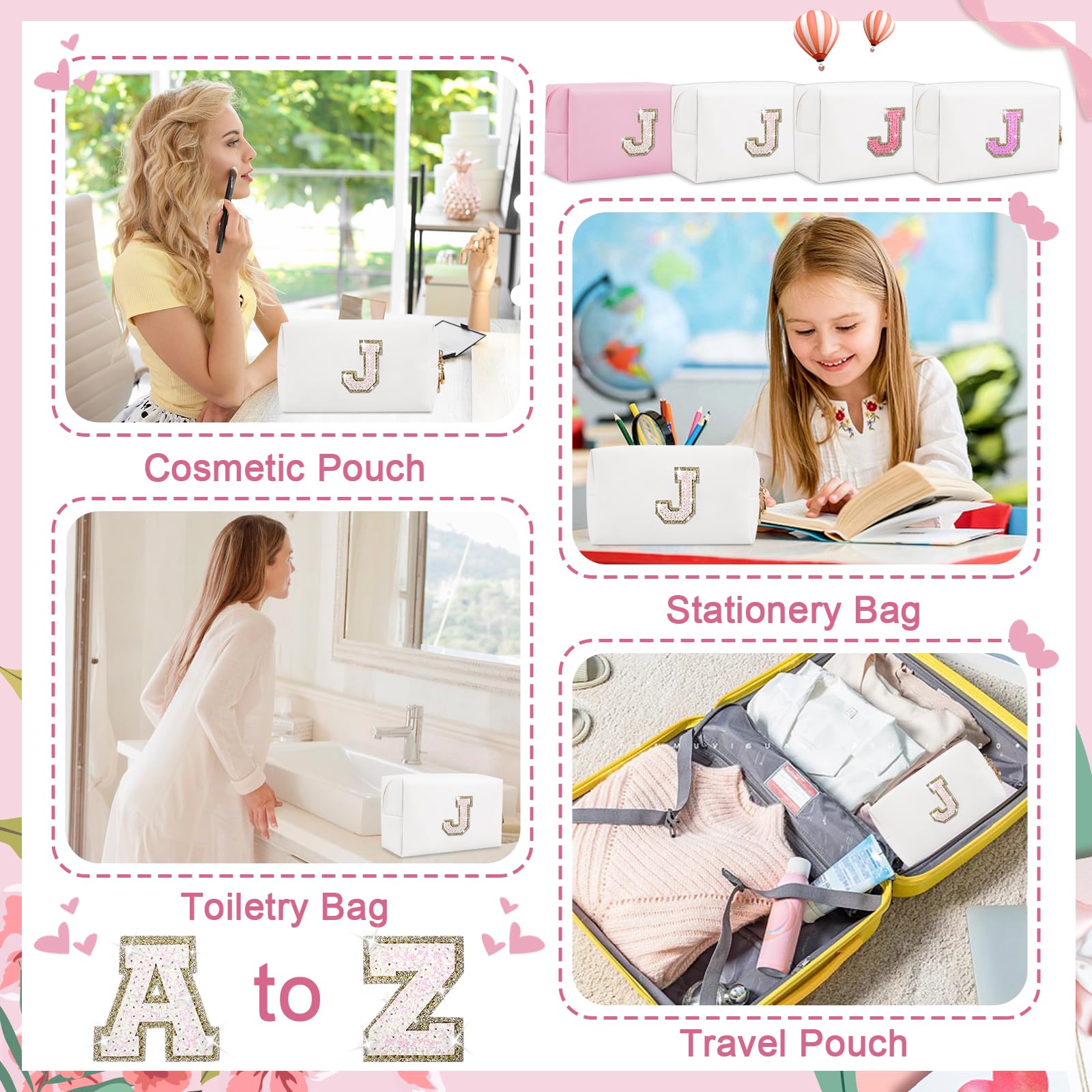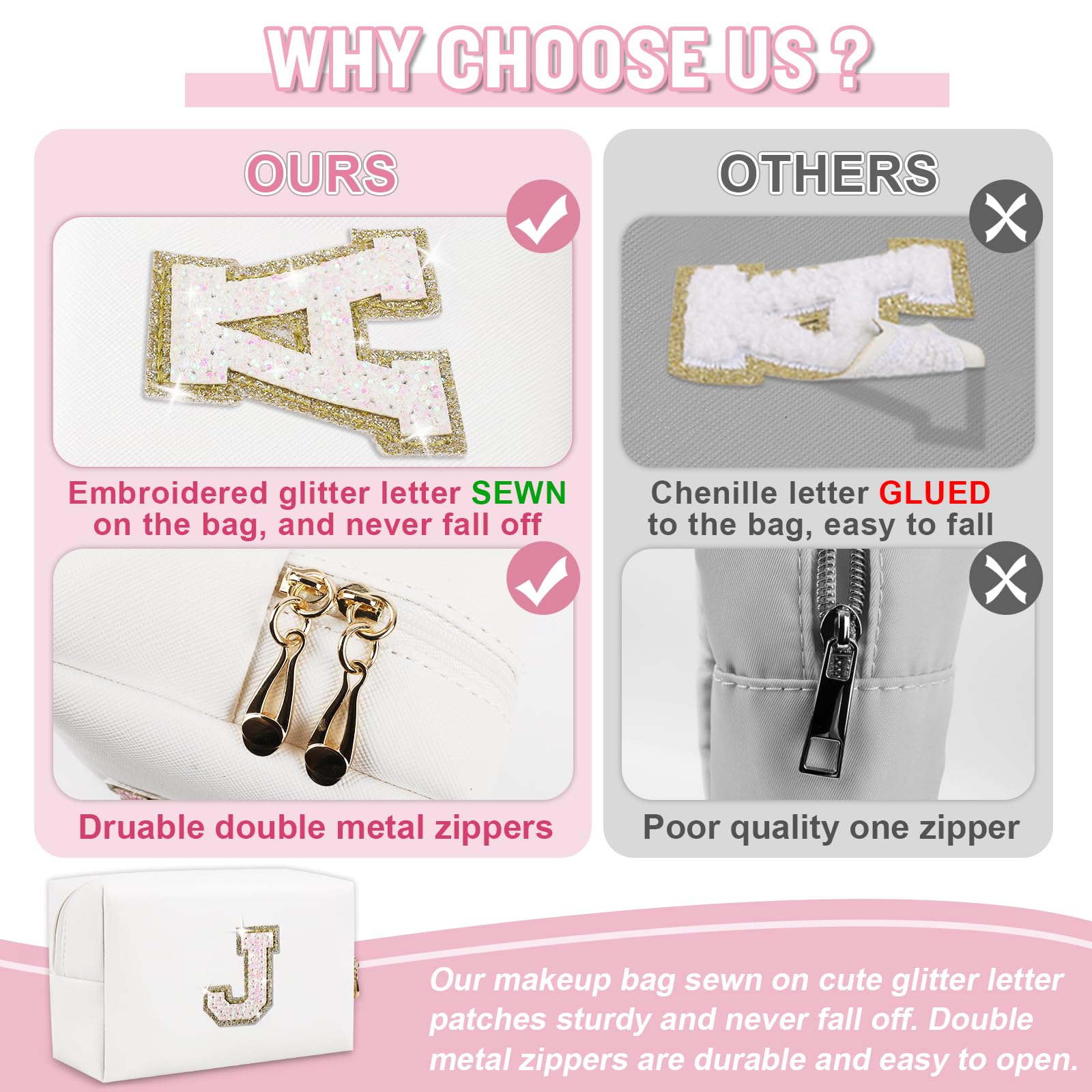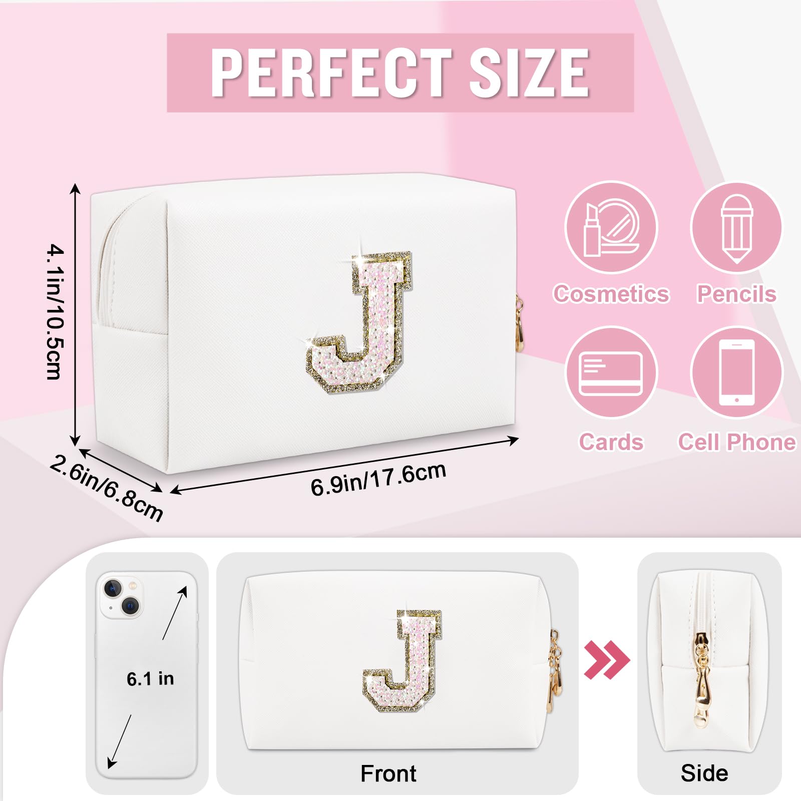 Personalized Initial A-Z Preppy Patch Makeup Bag, Small White PU Leather Cute Glitter Letter Cosmetic Bag with Zipper, Monogram Travel Toiletry Organizer Makeup Case Christmas Gifts for Women Girls,J