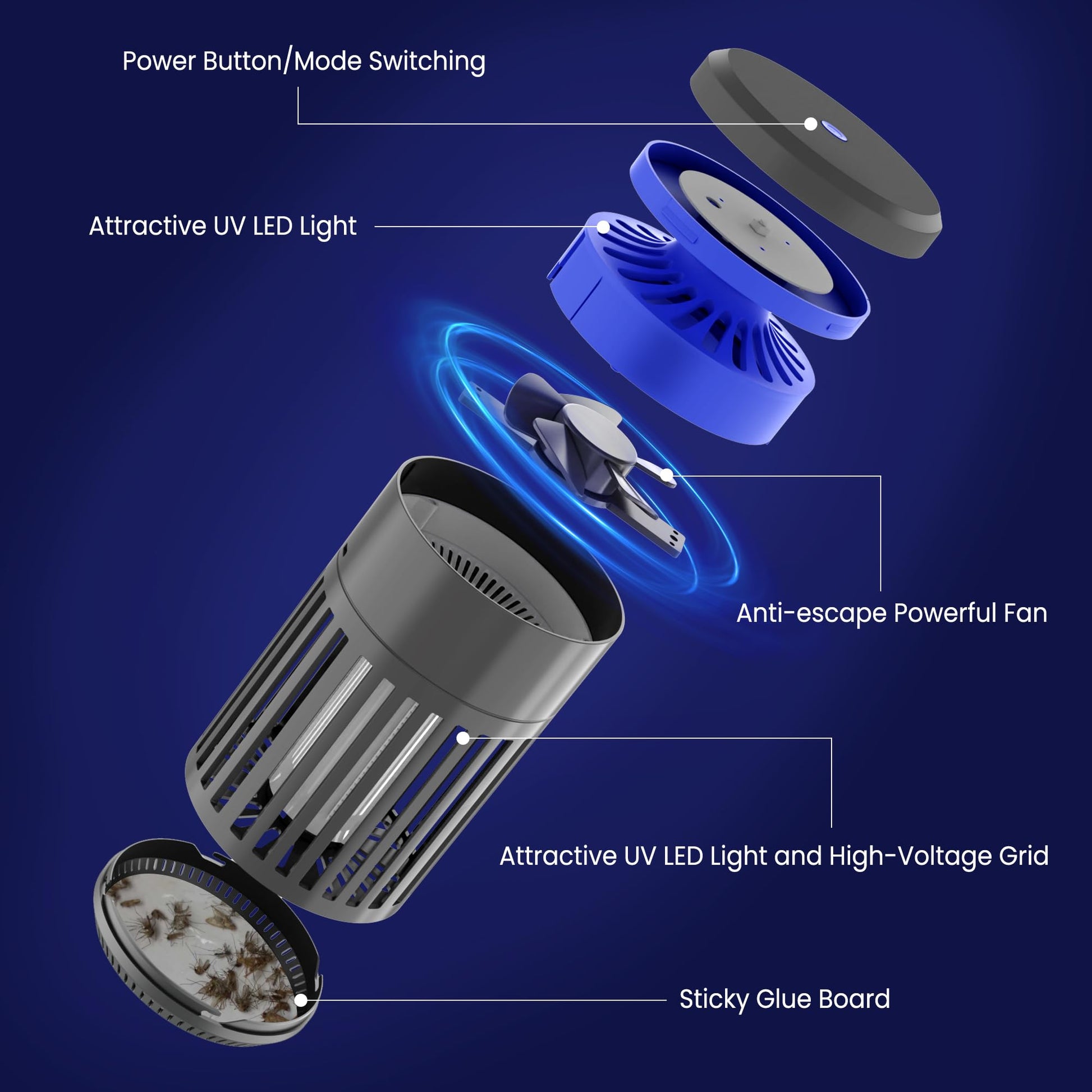 • Newly Upgraded Dual-functionality Bug Zapper - wiping out pesky flying bugs such as mosquitoes, Aedes, gnats, midges, flies, horse flies, fruit flies, moths, wasps, and more. It does the job using both suction and zapping methods.