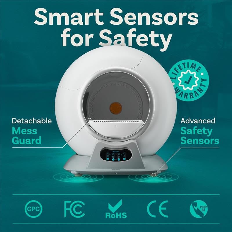• CAT SAFETY: Our Automated Self Cleaning litter box is equipped with multiple advanced sensors to detect your cat and automatically stop the self-cleaning when your cat enters or is inside, our anti-pinch design will make sure your cat is always safe