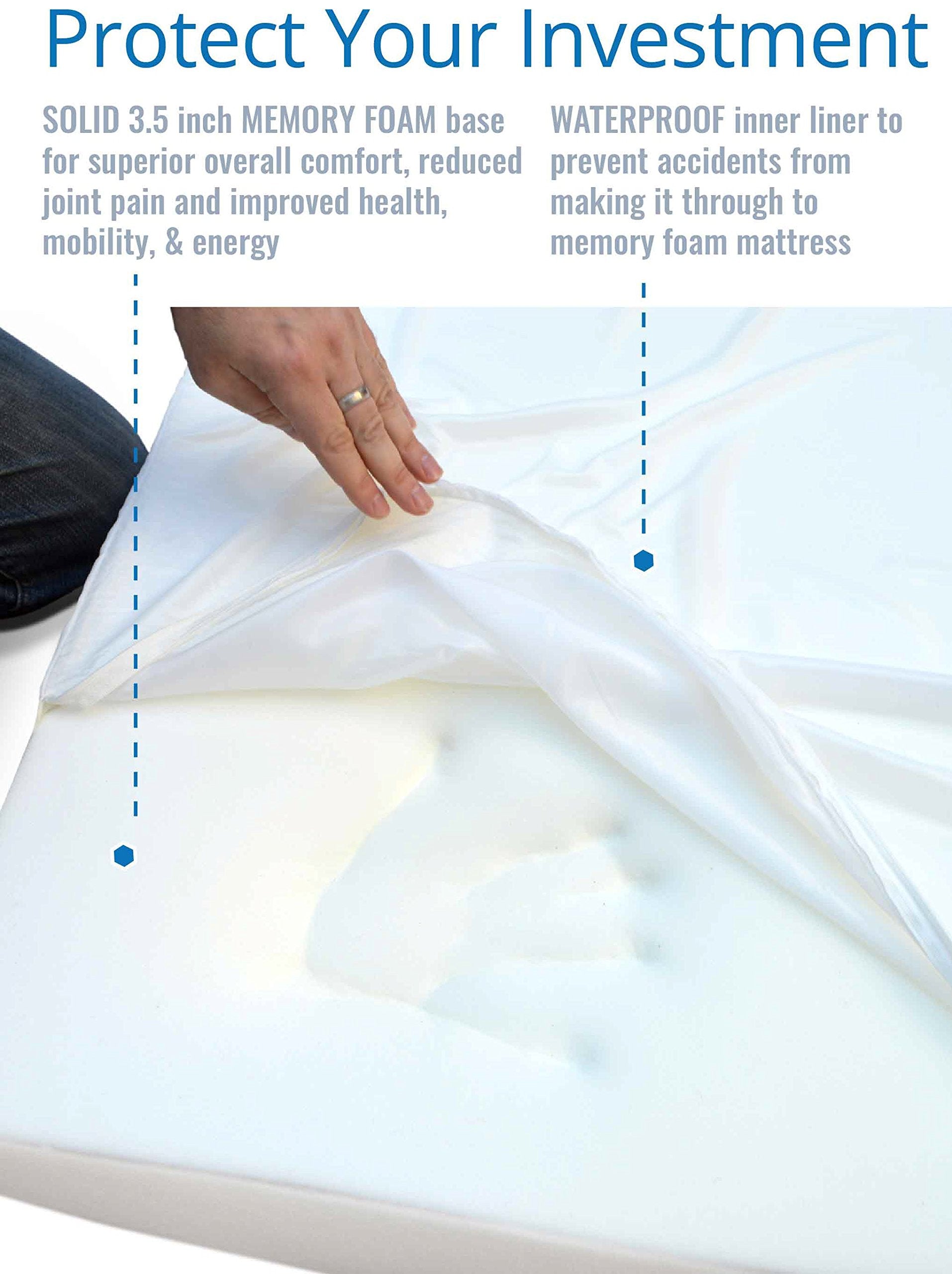 Details: Premium components: Solid 3. 5 inch memory foam base for superior overall comfort, improved health, mobility, & energy. Solid foam 2-bolster design for greater resting surface area. Durable & Comfortable 100% polyester micro suede fabric. Smart design: 100% waterproof memory foam liner protects your investment. Water resistant & tear resistant outer cover [nothing is chew proof! ]. Non-skid bottom. Replacement covers available separately. Easy to clean: removable cover is machine washable. Simple to spot clean & remove hair, two-compartment zipper design to make re-loading base & bolster easier.