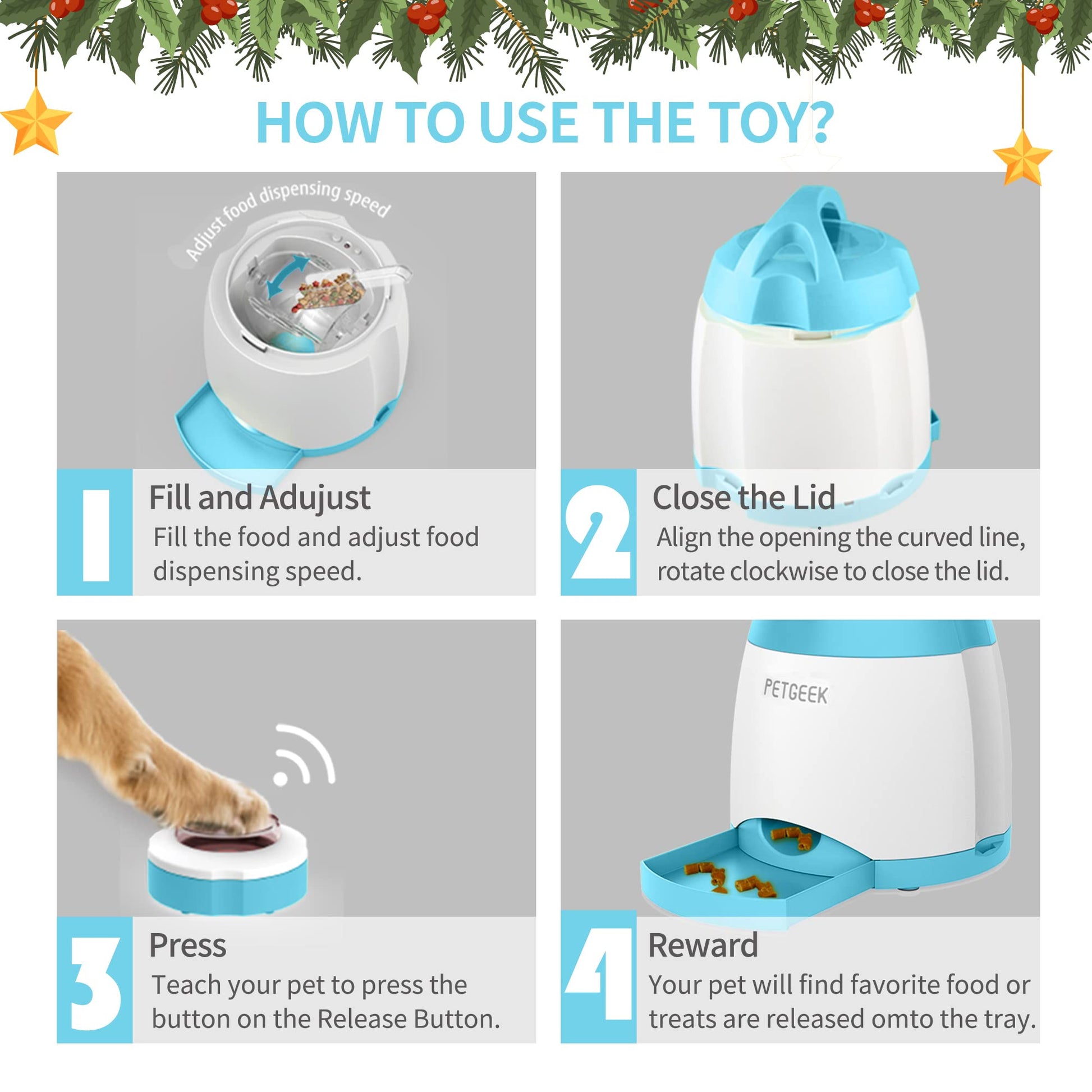 • AUTOMATIC DOG FEEDER: Petgeek automatic dog treat dispenser lets your pet eat food whenever they're hungry and develop good eating habits! Open the adjustable treat dispensing window, pour in your pet's favorite treats or dry food, when dog press on the release button, he will find treats or food are auto released onto the tray.