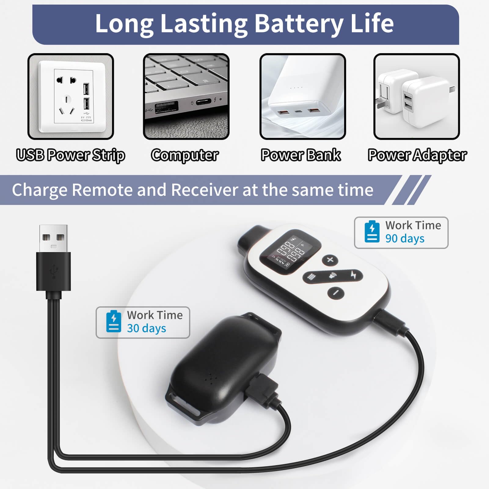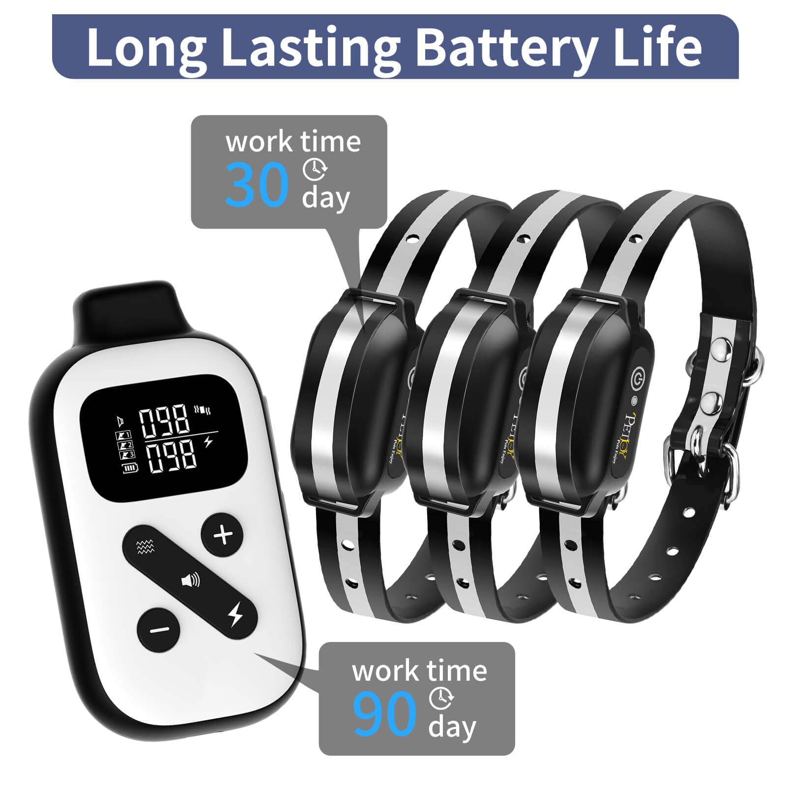• 【 Waterproof and Battery 】 The automatic bark collar has an IPX7 waterproof and long-life battery. The work time after a full charge is 90 days for remote control and 30 days for receivers.