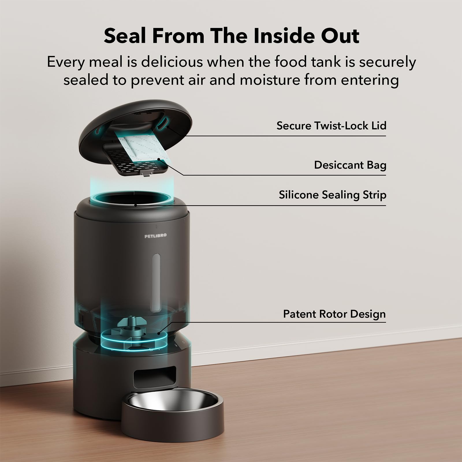 • Freshness in Every Bite: Patent rotor in the tank base and twist-lock lid of the automatic pet feeder prevent pets sneaking into the food dispenser for extra food. Built-in desiccant bag and sealing strip keep food fresh and crunchy. Food-grade stainless steel bowl provides healthy and hygienic feeding, saving your pets from chin acne.