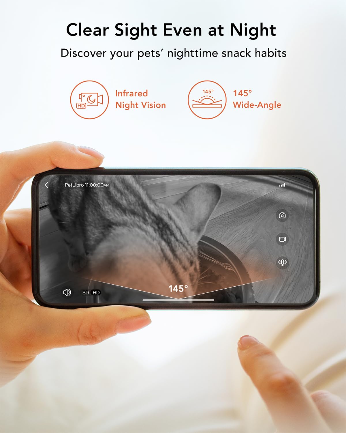 • 1080P HD Camera for Remote Monitoring: Using a high definition video camera with 1080P high resolution and 145° wide viewing angle, PETLIBRO smart pet feeder with camera allows you to see, hear how your beloved pet is eating when you’re on the go. And the videos can be saved on your micro SD card (not included) up to 256G. You can check the video playback in the APP to monitor your pet’s eating habits. The built-in camera supports IR night vision, enabling you to see your pets in the dark clearly.
