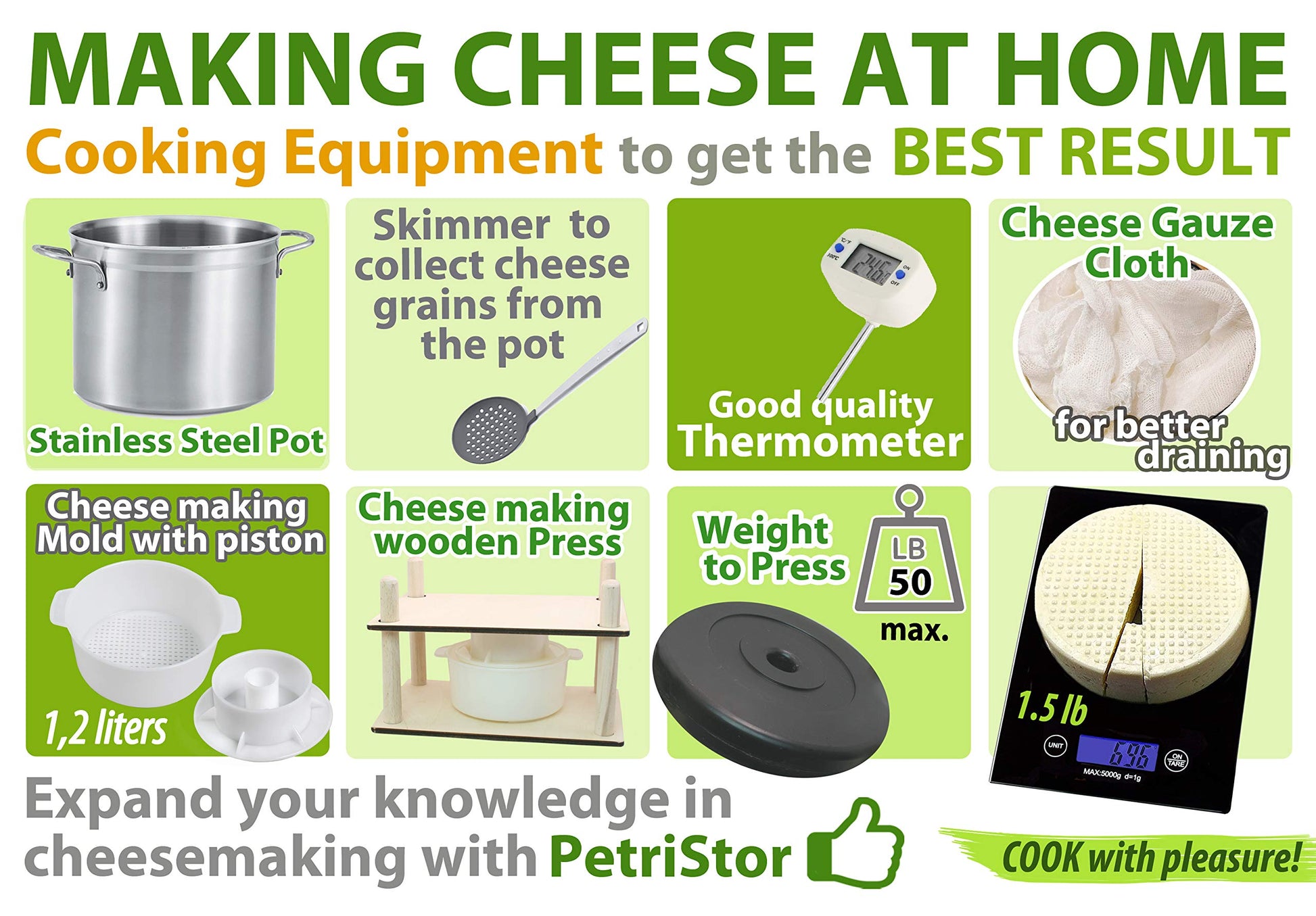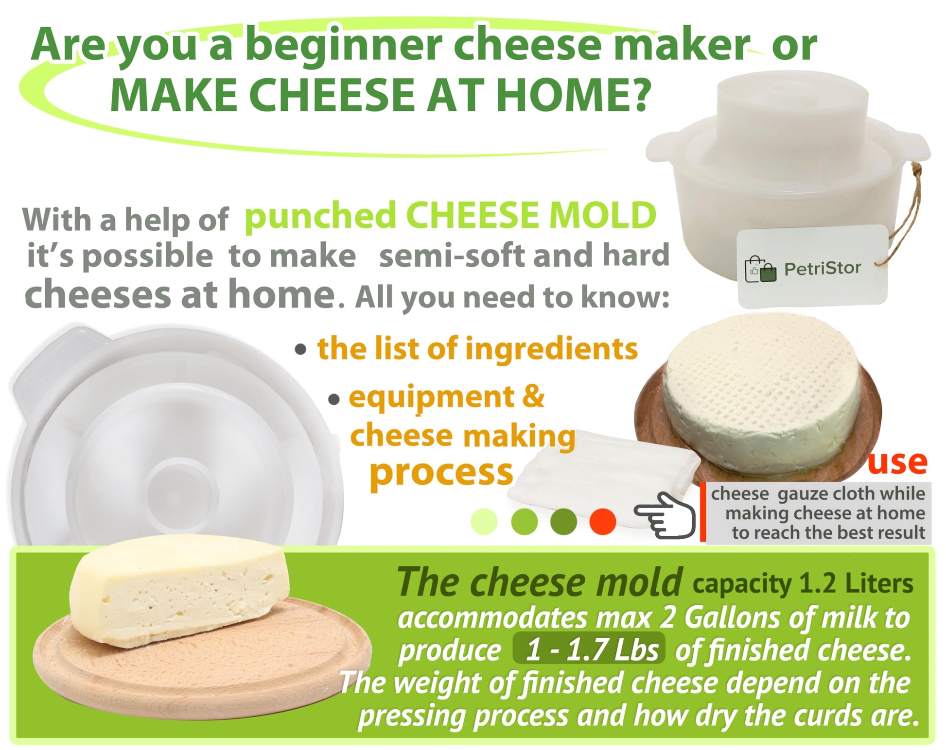 PetriStor Cheese Mold for Cheese Making Cheese with Follower Piston 1.3QT and Cheesecloth - Cheese Form Mold - Cheese Making Basket - Paneer Cheese Press Mold - Molde Para Queso