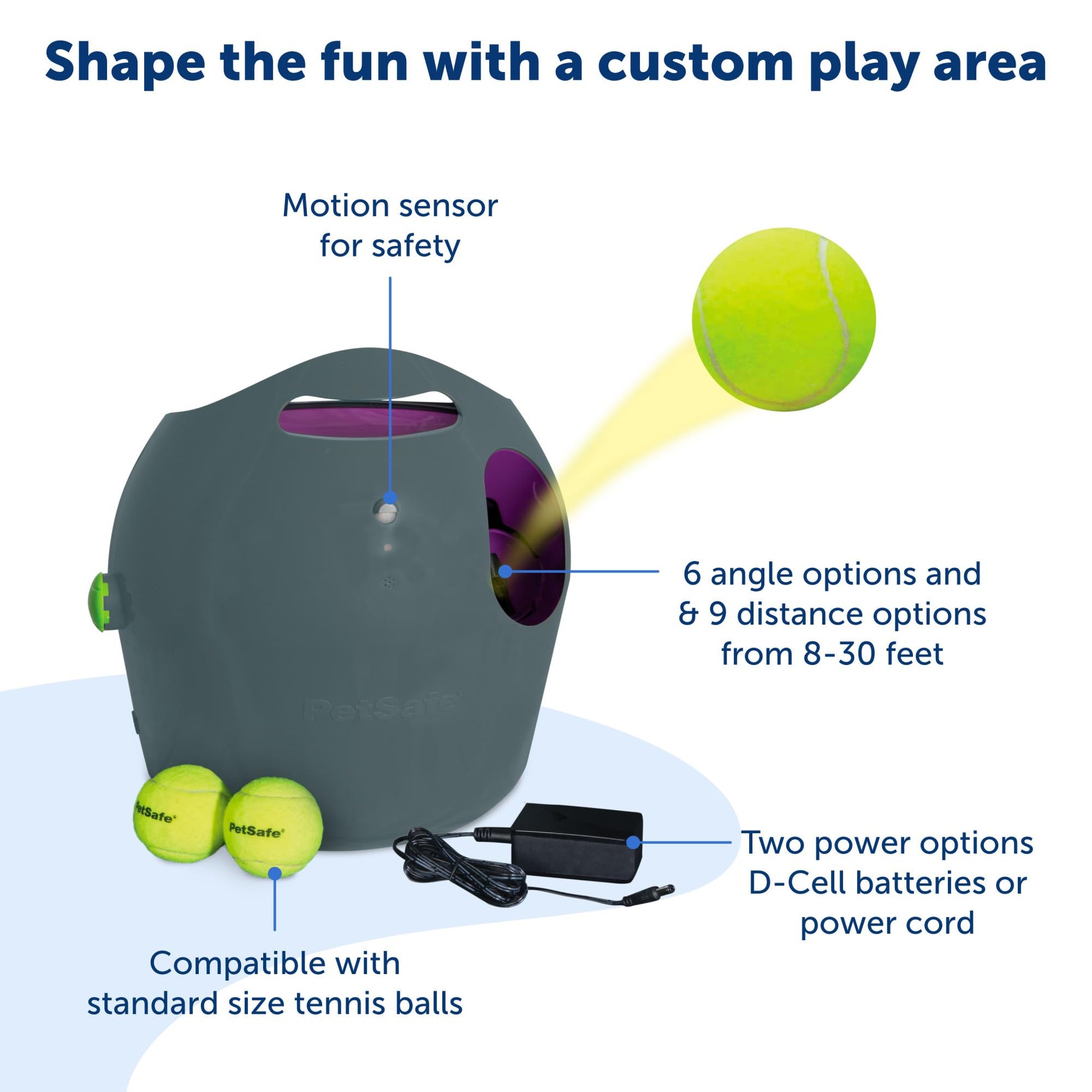 Details: Let your dog play fetch anytime with the PetSafe Automatic Ball Launcher—a fun, smart, and safe way to keep your pup moving even when your arm gets tired. This automatic fetch machine is perfect for active dogs that can’t get enough of chasing tennis balls, offering engaging solo play with adjustable settings and built-in safety features. Designed for indoor or outdoor use, this ball launcher features nine distance settings and six angle options, allowing you to customize each session based on your space and your dog’s activity level. Use it in the backyard, hallway, or living room—wherever your dog likes to play. The included two tennis balls are soft and safe, compatible with standard-sized balls, and the unit can hold up to three at a time for uninterrupted fun. To keep your dog safe, the PetSafe Automatic Ball Launcher includes motion sensors that detect pets standing within 7 feet of the launch pocket, pausing until they move to a safe spot. It also emits audible tones to signal a throw, helping your dog anticipate the launch and avoid surprises. Since 1988, PetSafe has been driven by a simple belief: safe, healthy pets lead to happier lives for pets and their families. For over 25 years, we've been dedicated to enhancing the lives of pets and the people who love them, treating every pet as a cherished family member and delivering life-changing innovations designed to enrich every moment. With U.S. roots and a global reach, our vet- and trainer-recommended products are built for every pet and backed by exceptional customer support. From backyards to dog parks, we're on a mission to create fields of joy for happy, healthy, and safe pets.