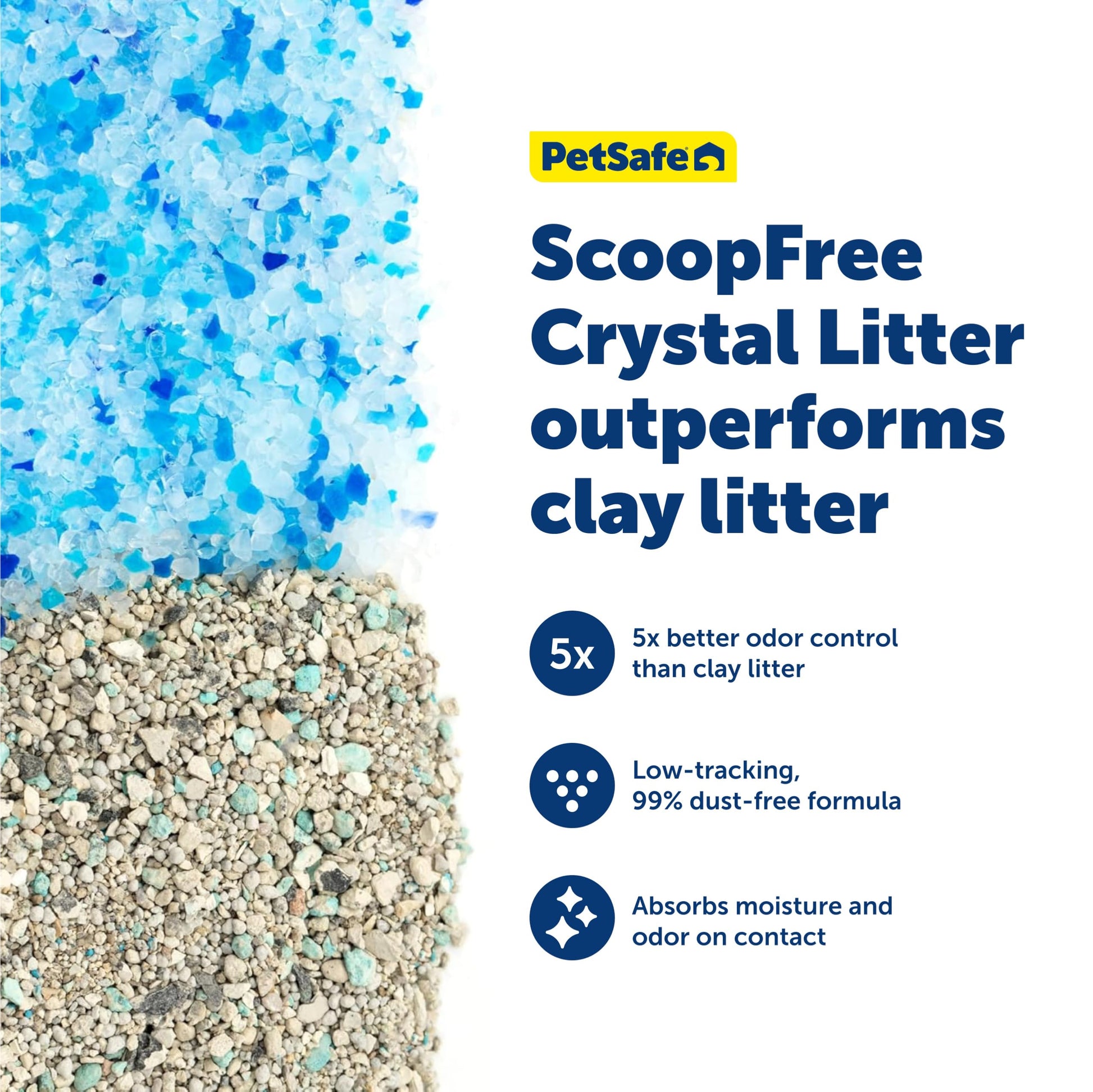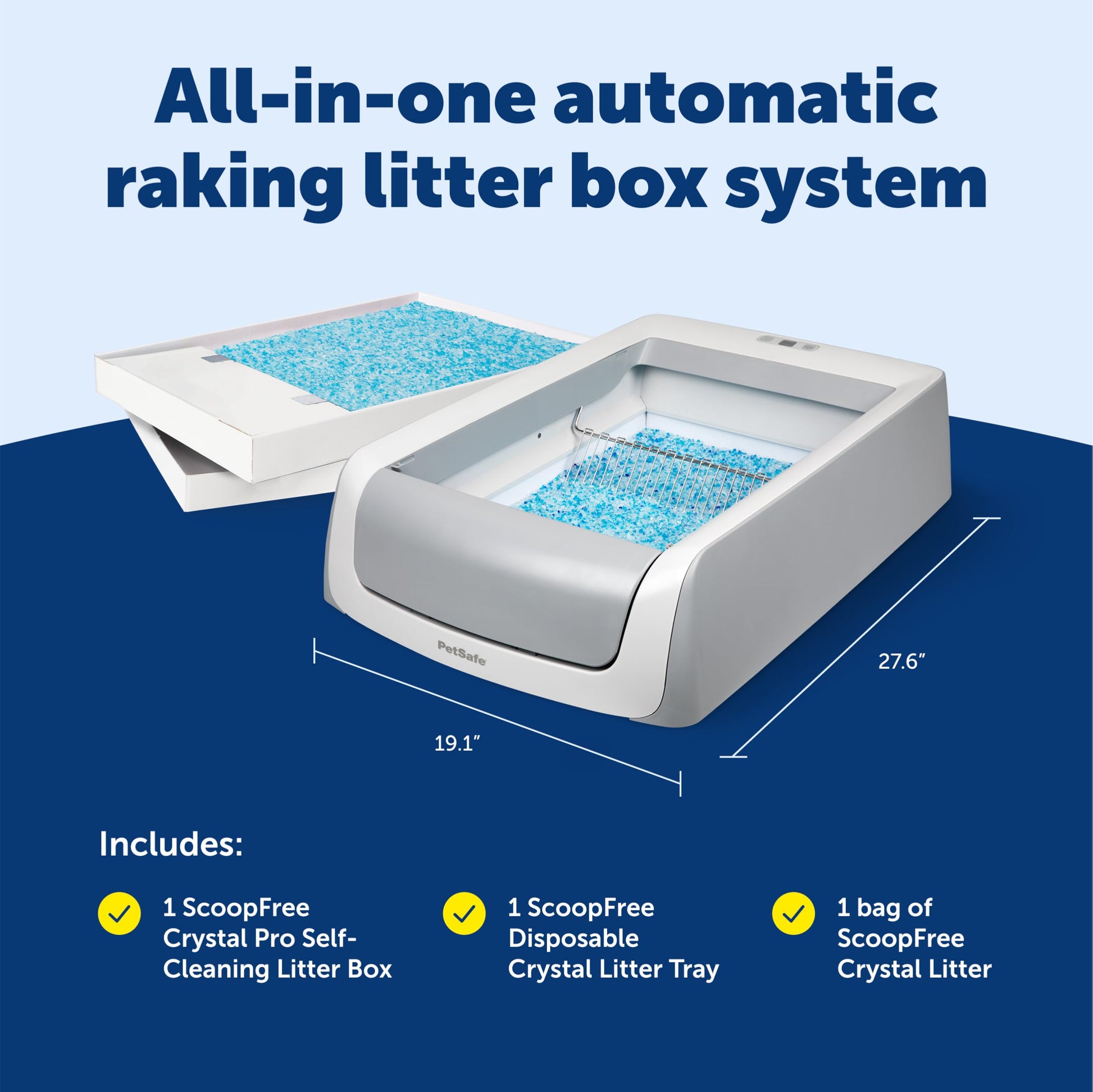 Details: The PetSafe ScoopFree Crystal Self-Cleaning Automatic Litter Box offers a hands-free, odor-free solution for maintaining a clean and healthy environment for your indoor cat. This electric, motion-sensing cat box uses advanced self-cleaning technology to automatically rake waste into a covered compartment once your cat leaves, eliminating the need for daily scooping. This top-entry box uses non-clumping crystal litter that absorbs liquid, dehydrates solid waste, and neutralizes odors up to five times more effectively than traditional clumping litter. With low-tracking, 99% dust-free crystals and leak-proof plastic liners, this system keeps your floors stain-free and your home fresh. Tray replacement is simple: just slide out the used tray and dispose of it with the included lid for quick, hygienic cleanups with minimal effort. An integrated health counter tracks your cat’s litter box usage, helping you monitor their well-being and detect potential issues early, while the crystal litter is gentle on their paws. Whether you're a busy pet parent or simply looking for a more efficient way to manage your cat’s litter, the PetSafe ScoopFree Crystal Pro delivers a streamlined, easy-to-use experience that keeps your cat comfortable and your home odor free. Since 1988, PetSafe has been driven by a simple belief: safe, healthy pets lead to happier lives for pets and their families. For over 25 years, we've been dedicated to enhancing the lives of pets and the people who love them, treating every pet as a cherished family member and delivering life-changing innovations designed to enrich every moment. With U.S. roots and a global reach, our vet- and trainer-recommended products are built for every pet and backed by exceptional customer support. From backyards to dog parks, we're on a mission to create fields of joy for happy, healthy, and safe pets.