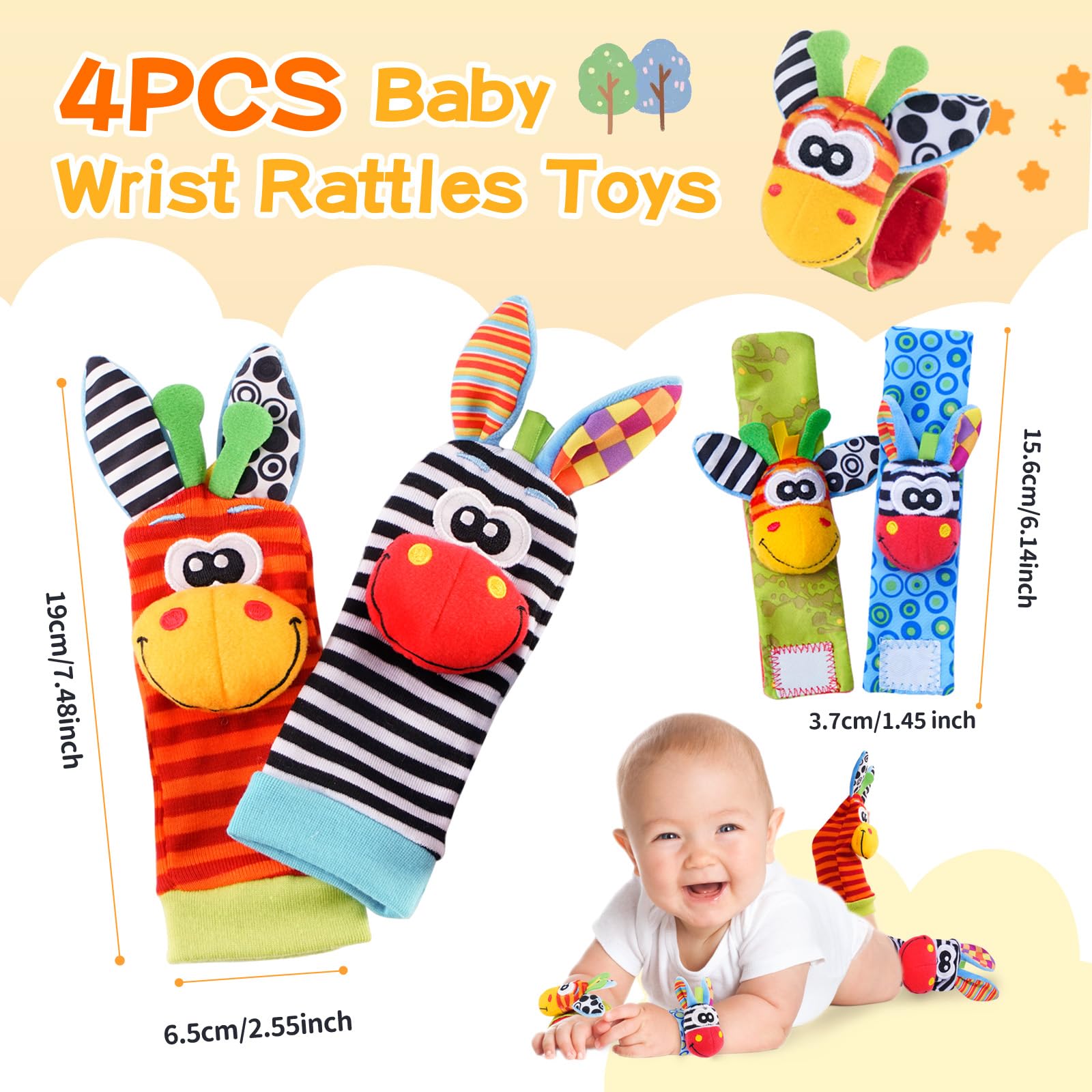 • SAFETY and COMFORTABLE : Infant toys 0-6 months Made of breathable, non-toxic, and BPA-free fabrics, our baby sensory toys for wrist rattles and foot finder socks are CPC certified to ensure your baby's safety. The colorful and Cute animal designs are super soft and comfy to wear, and the adjustable velcro on the wrist rattles ensures a perfect fit