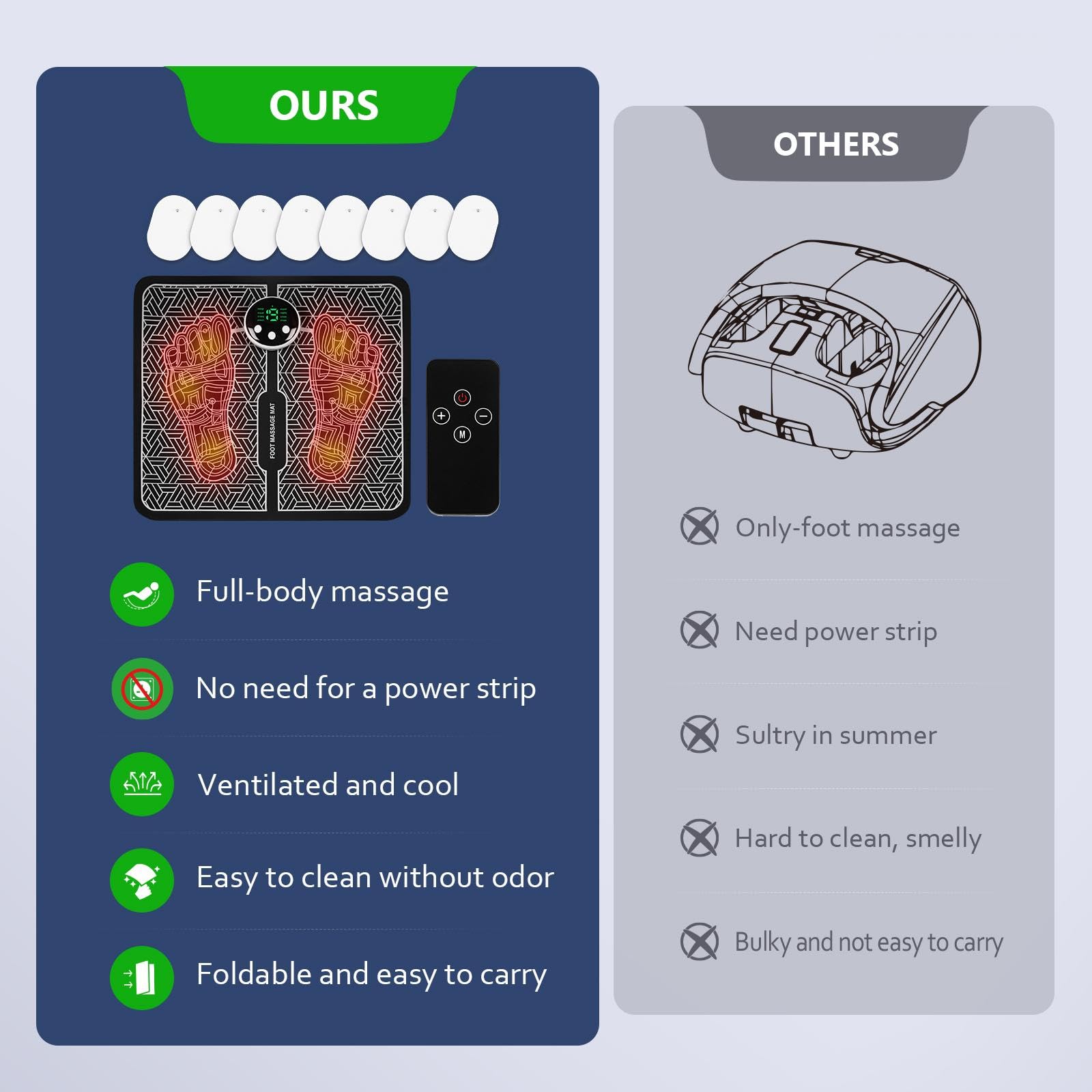 • 【Convenient to Carry】The device is convenient to carry and is suitable for personal healthcare. 2-in-1EMS Foot Massager and body massage pad. The massage pad features a waterproof PU leather surface and a rubber bottom, combining durability and slip resistance. The body massage pad can be used on other body parts – from shoulders to calves – either in conjunction with the foot pad or on its own.