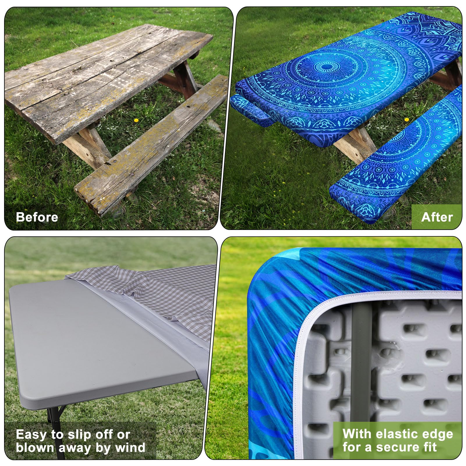 • EASY INSTALL WINDPROOF: Both table cover and bench cover designed with elastic corners, not only can prevent unexpected movements and stay firm in windy conditions, but also easy to install and uninstall by yourself, so your happy picnic time won't be disturbed.