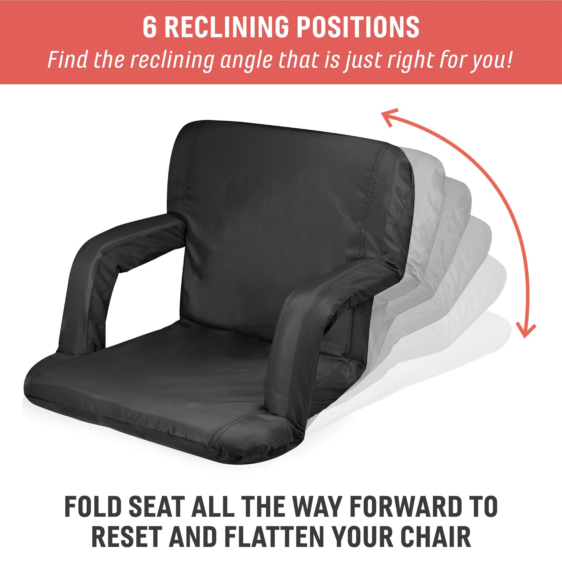 PICNIC TIME Ventura Portable Reclining Stadium Seat with Back Support, Folding Bleacher Chairs with Back and Cushion, Thick Padded Stadium Seat and Armrest, Includes Six Backrest Positions, (Black)