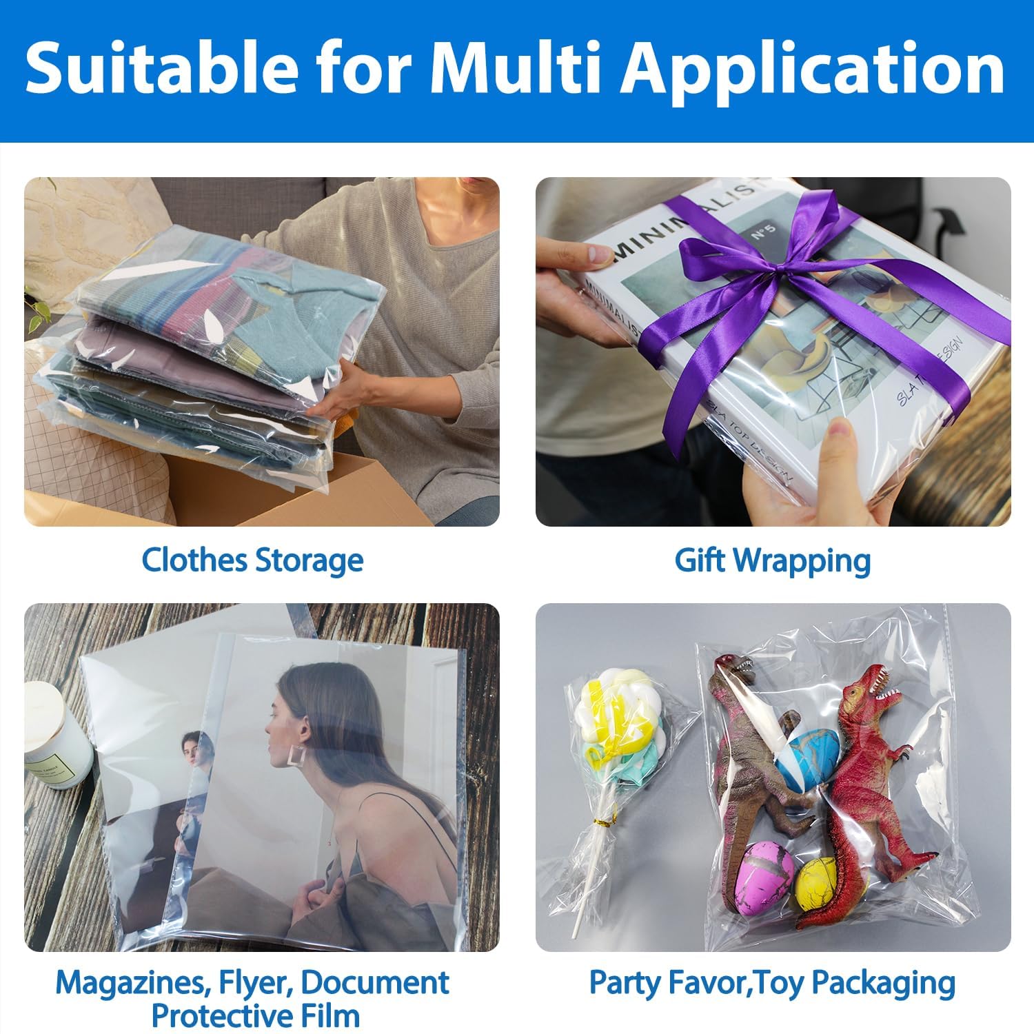 • WIDE APPLICATIONS: The self sealing cellophane bags are suitable for common retail, storage, and packaging needs. You could package t-shirts, shirts, jeans, and hoodies to make them more professional; Also it's suitable for packaging documents, photos, and artwork to protect them from moisture.