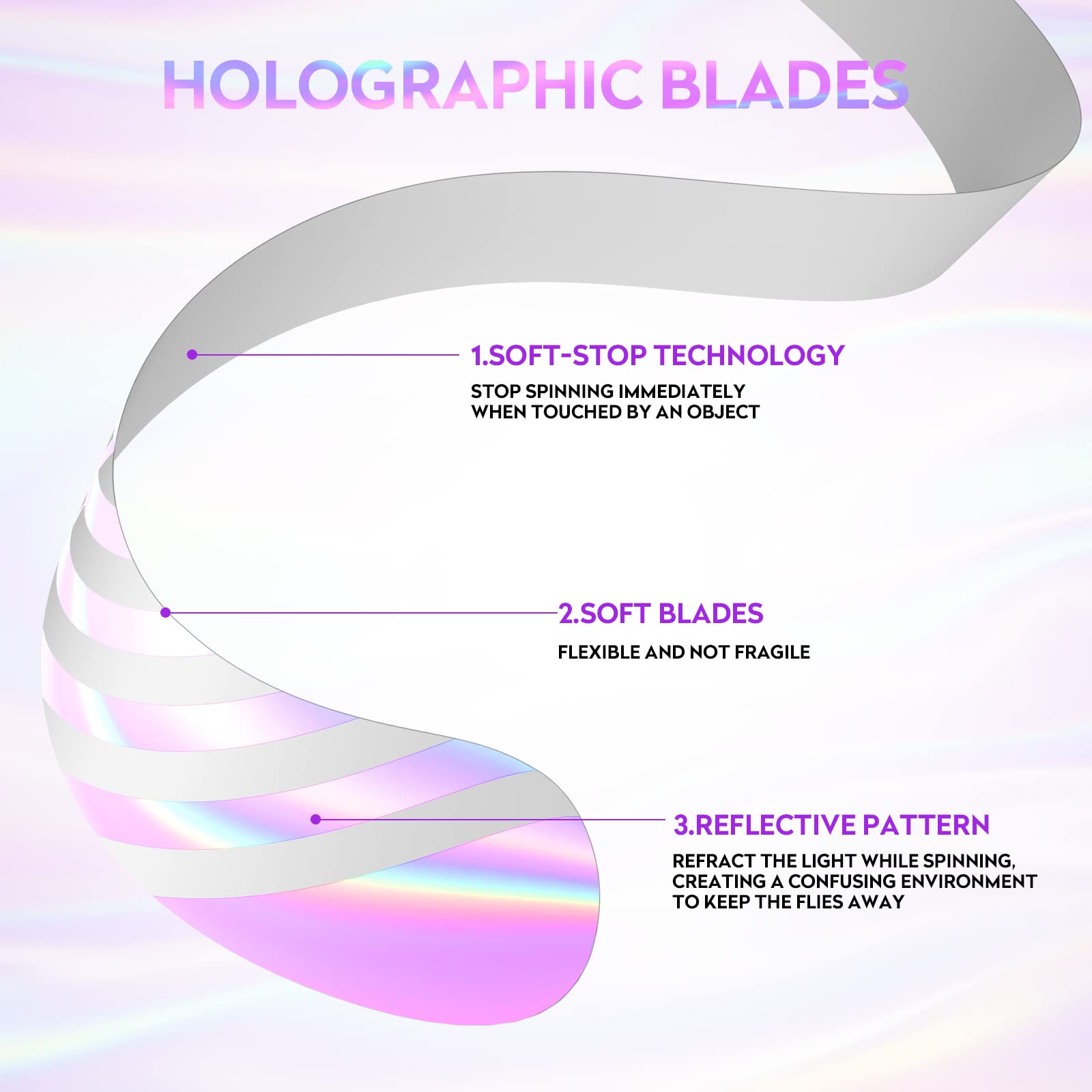 • 【Reflective and Safe Fan Blades】The holographic dots pattern blades of the food fly fan for outdoor table can refract light that stimulate flies. Furthermore, these soft-touch blades are designed to stop instantly on touch, and turns again after the object is removed. So it won't hurt our hands or children