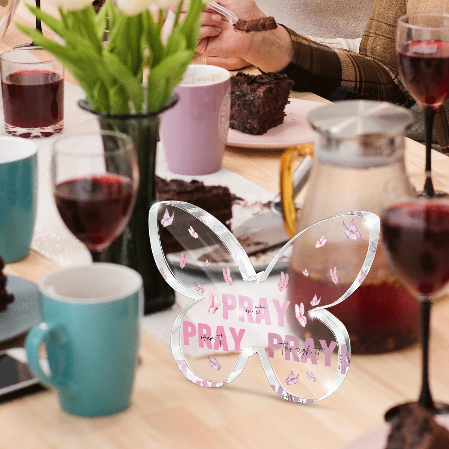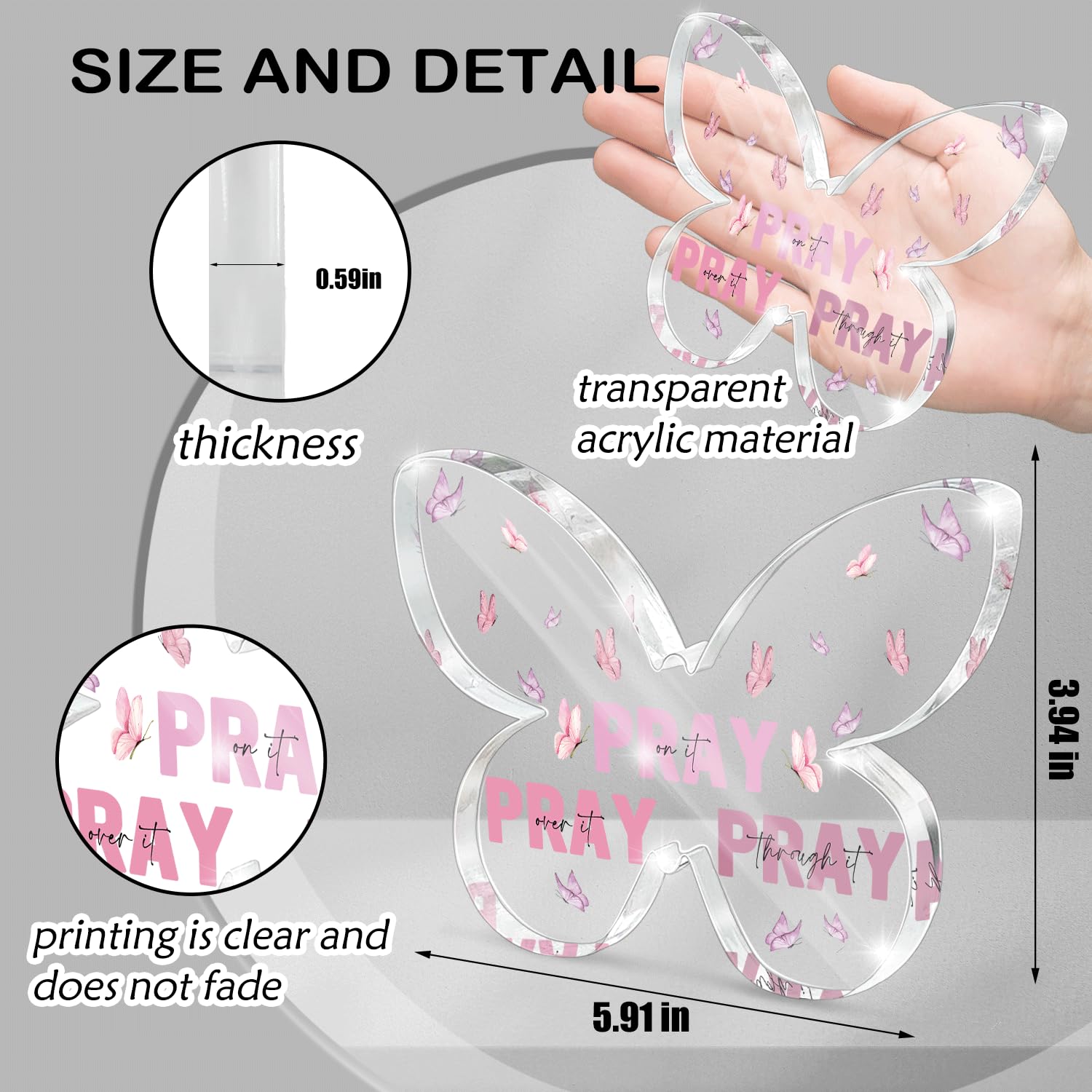 Pink Christian Gifts for Women, Religious Plaques Christian Woman Decor Gifts, Modern Home Office Room Bathroom Bedroom, Pray On It Over It Acrylic Sign for Teacher Boss Friend(Butterfly)