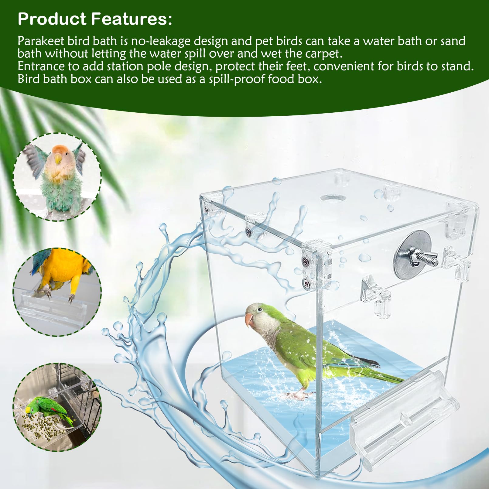 • Product Features:Parakeet bird bath is no-leakage design and pet birds can take a water bath or sand bath without letting the water spill over and wet the carpet. Bird bath box can also be used as a spill-proof food box. Entrance to add station pole design, protect their feet, convenient for birds to stand