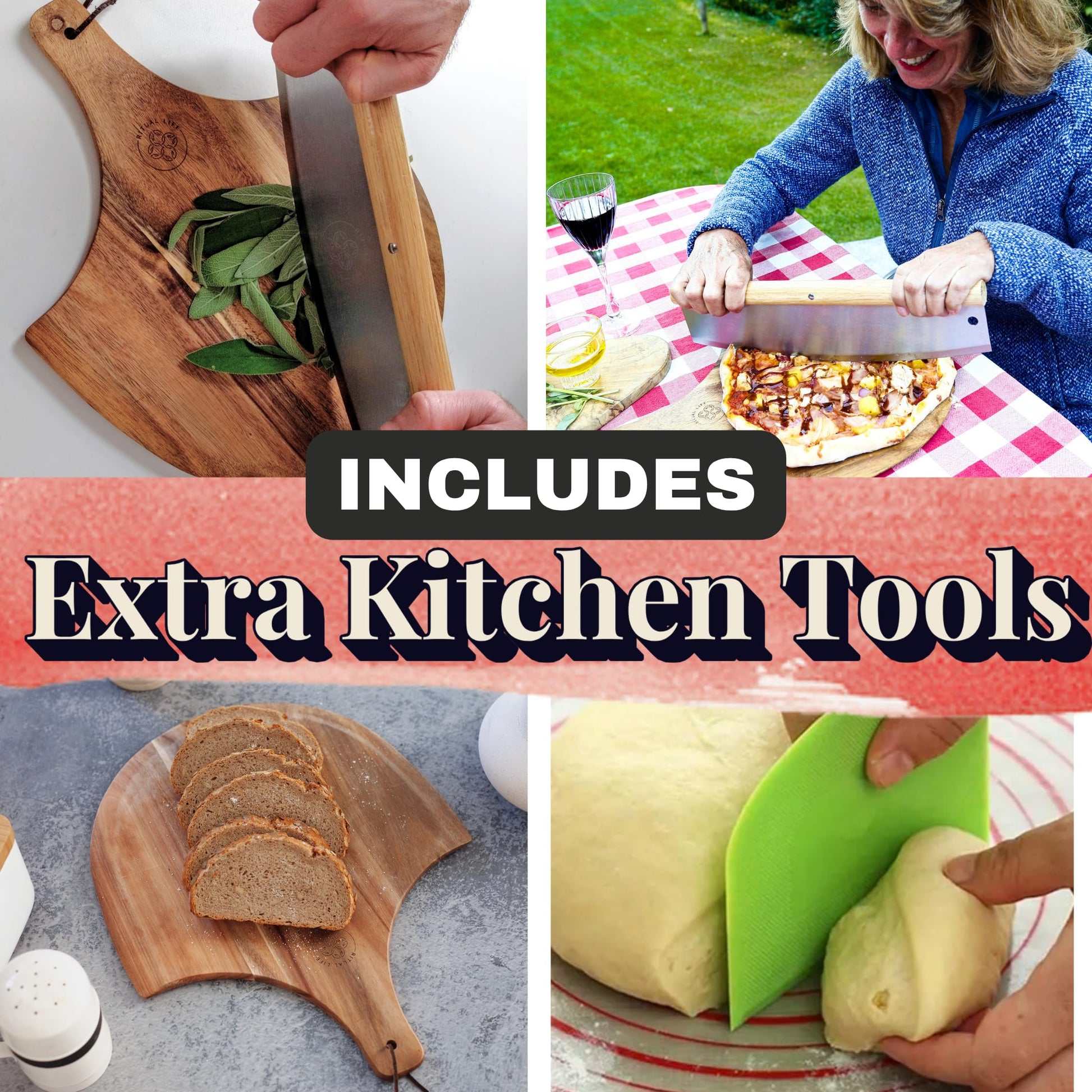 • COMPLETE 5-PIECE PIZZA MAKING SET: Includes everything you need - durable pizza stone with removable stainless steel handles, acacia wood pizza peel, stainless steel pizza cutter with comfort wooden handle and blade cover, recipe ebook, and dough tool scraper. Essential tools for both beginners and experienced pizza makers.