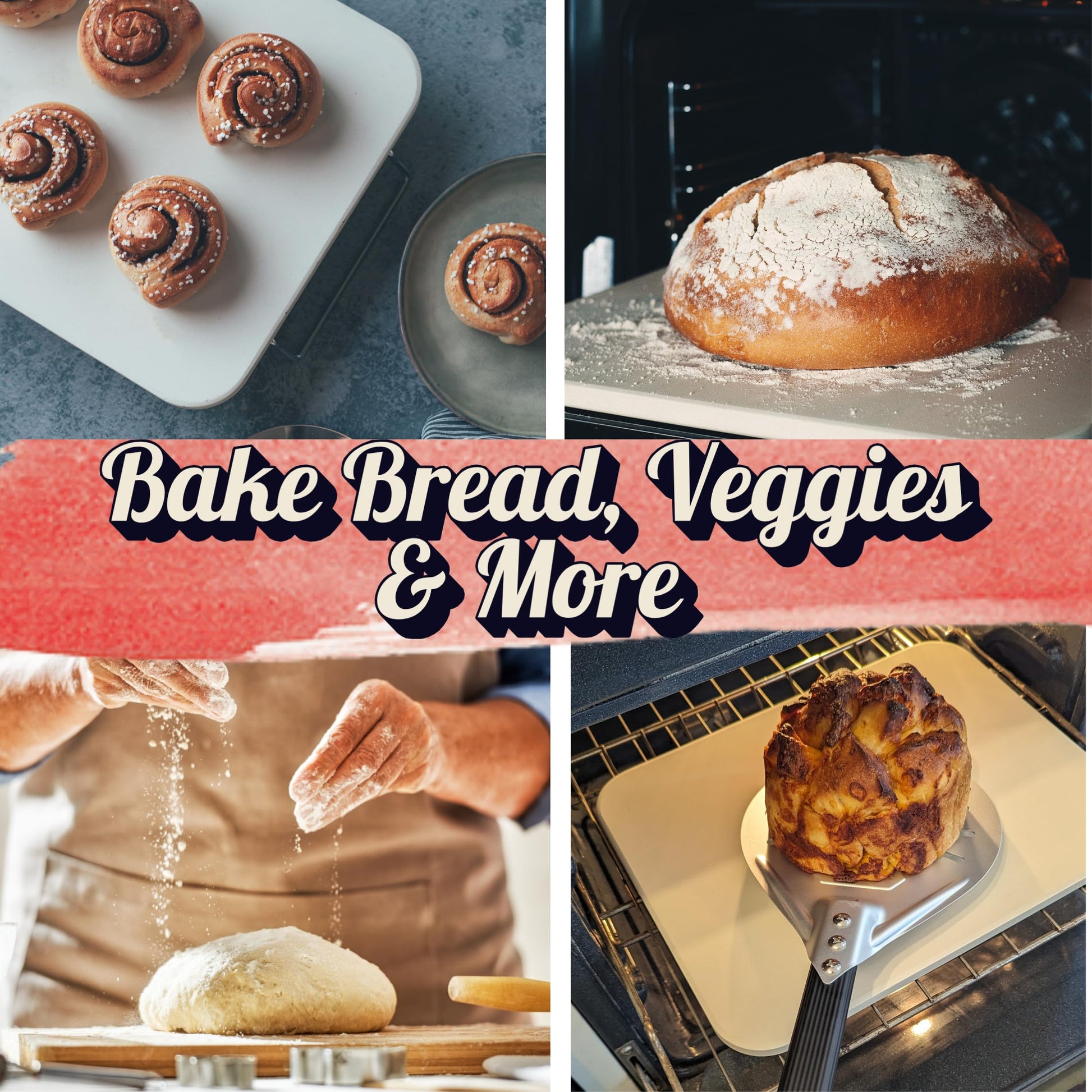 • EASY TO USE & VERSATILE: Beyond just pizza, our oven stone offers endless possibilities. Use it as nonstick bread stone for oven, baking stone for sourdough bread, biscuits, cookies, pastries, and more. The wood peel doubles as a cutting board or serving tray, while the slicer effortlessly cuts your food cleanly and precisely.
