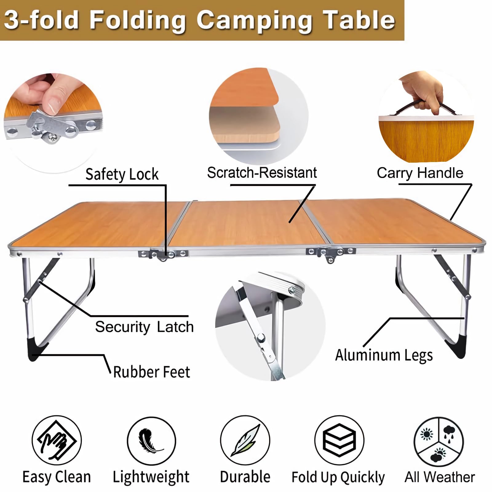 PLANEXPERT Folding Camping Table,3 Feet Portable Outdoor Table with Aluminum Legs,3 Fold Lightweight Beach Table with Handle,Camping Accessories for Home Picnic BBQ Garden Cooking