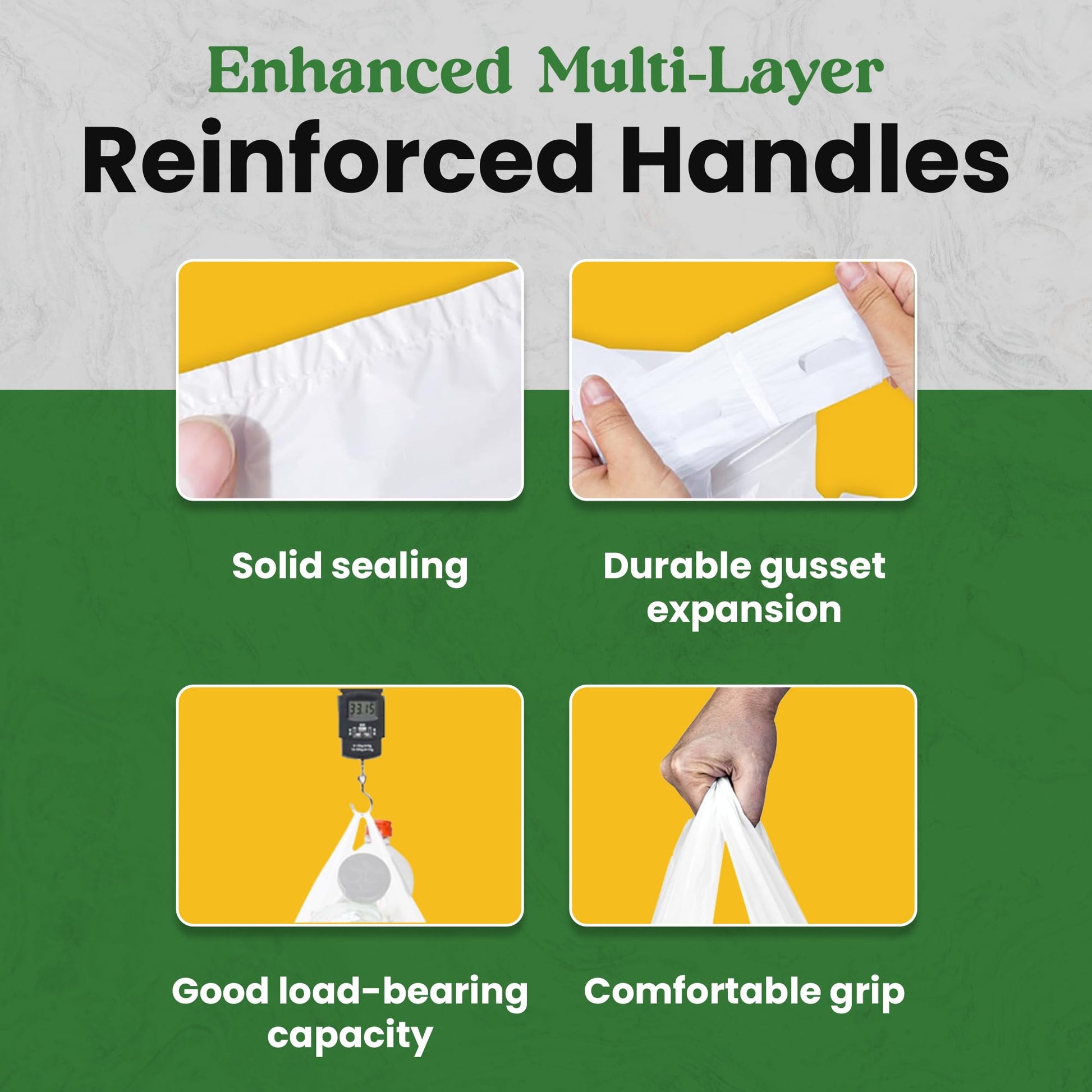 • Thick and Durable - Constructed from premium HDPE plastic with a thickness of 0.492 mil, these shopping bags offer excellent strength and reliability. They're capable of handling groceries, takeout orders, and retail goods without tearing or breaking. PACKAGE QUANTITY This item was package by weight which may lead to minor discrepancies.