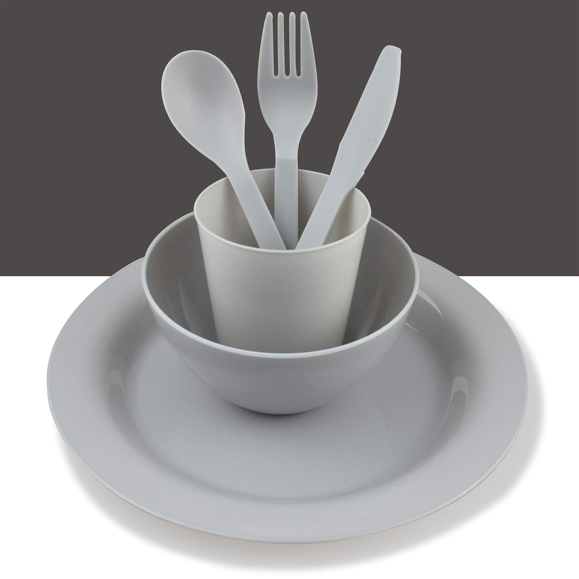 • 【PORTABLE TABLEWARE SET】: 24 piece tableware set includes 4 plates; 4 cups; 4 bowls; 4 spoons; 4 knifes and 4 forks, packaged in a drawstring mesh bag, compact and lightweight occupying little space, apt to encase, store and carry,serve for 4 people