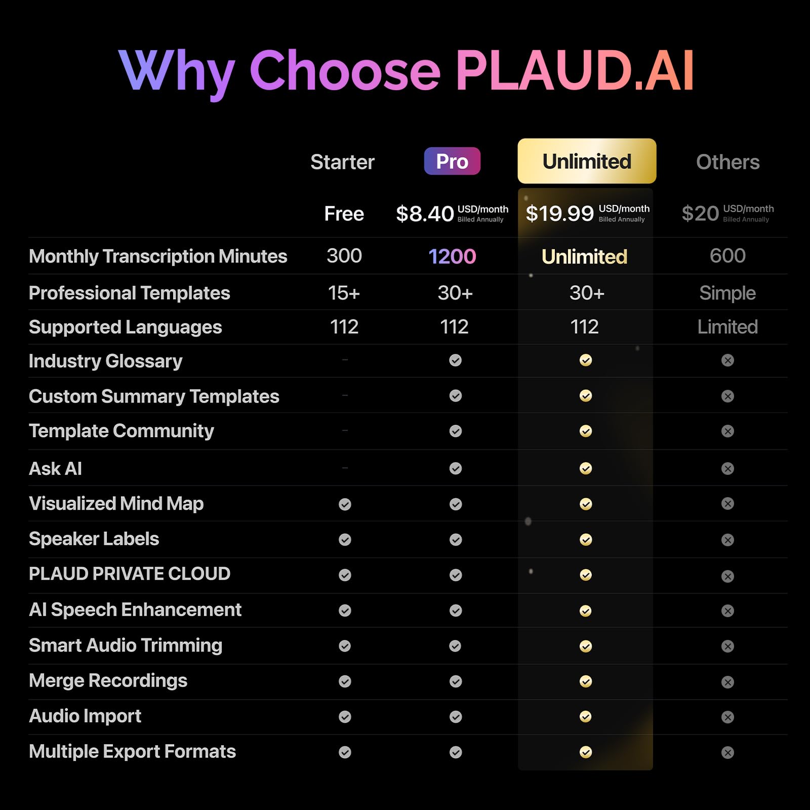 • NOTE: Once you activate your PLAUD NOTE, you will get a free Starter Plan, which includes 300 transcription minutes per month. If you need more minutes, you can subscribe to the Pro Plan or purchase more transcription time. The Pro Plan is $8.33/month ($99/year, $17.99/single Month), which includes 1200-minute monthly AI transcription & summary time and more professional summary templates.