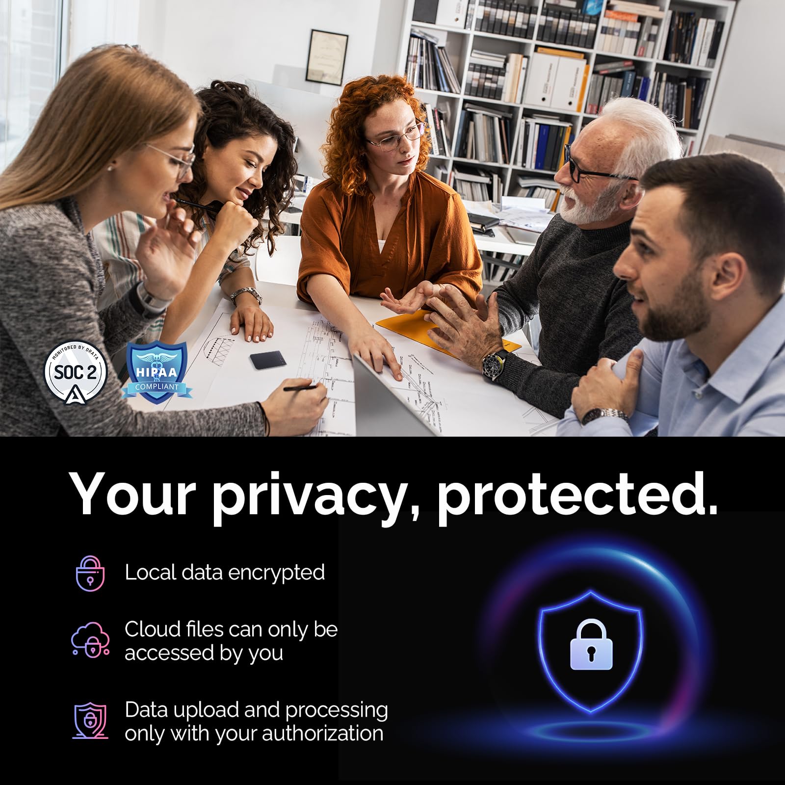 • YOUR PRIVACY COMES FIRST: Local data encrypted, cloud files exclusive to you, with data processing only upon your authorization. PLAUD App and Web portal offer unlimited cloud storage. Effortlessly manage audio files, sort them, and share recordings, transcriptions, and summaries with ease. Enhances team collaboration through transcription and summarization features