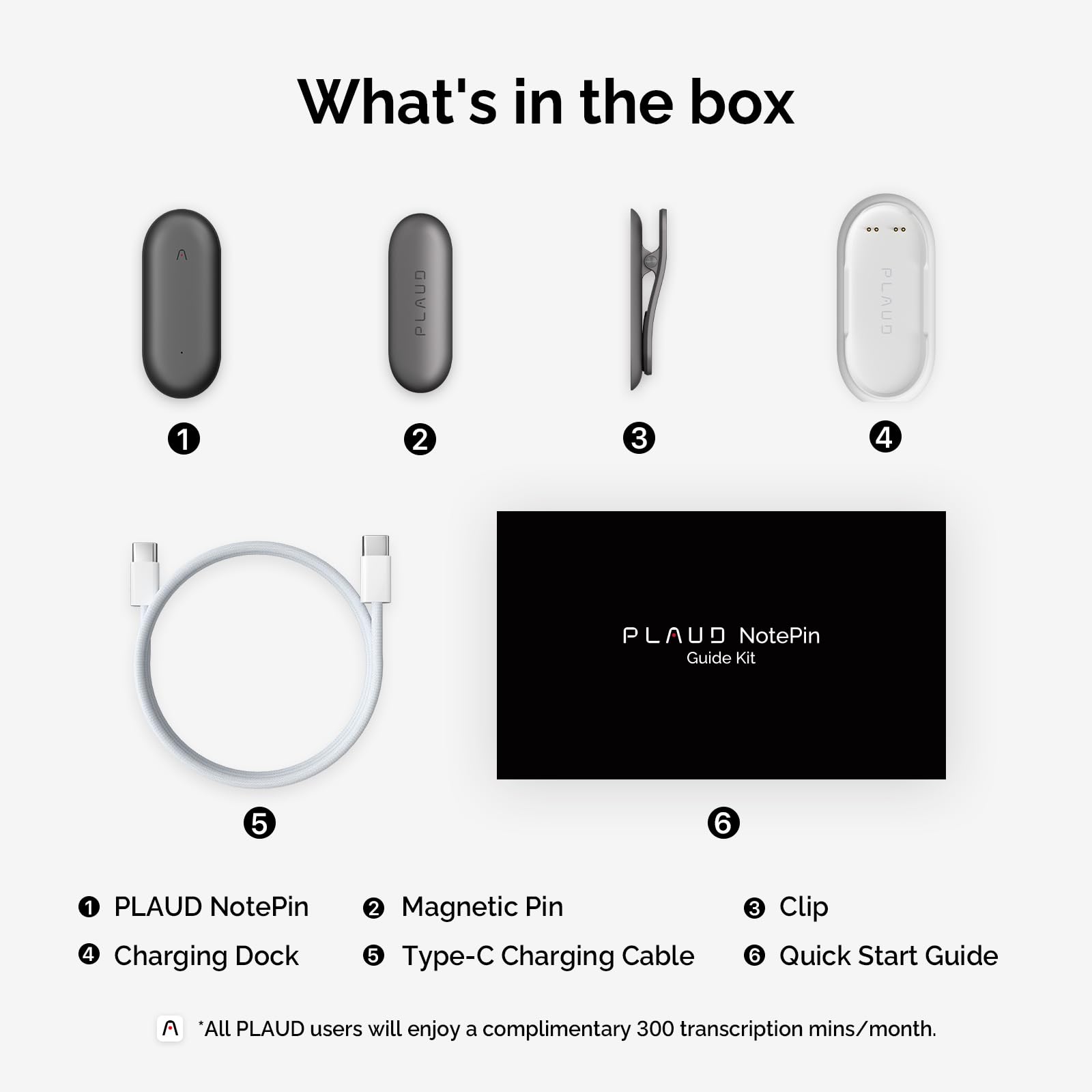 • EVERYTHING YOU NEED IS INCLUDED: 1 PLAUD NotePin Voice Recorder, 1 Magnetic Clip, 1 Charging Dock, and 1 USB-C Charging Cable. All PLAUD users will enjoy a complimentary 300 transcription mins/month. Additionally, you can configure Wi-Fi for automatic file uploads to PPC (while charging) and easily locate your NotePin using Apple’s Find My app.