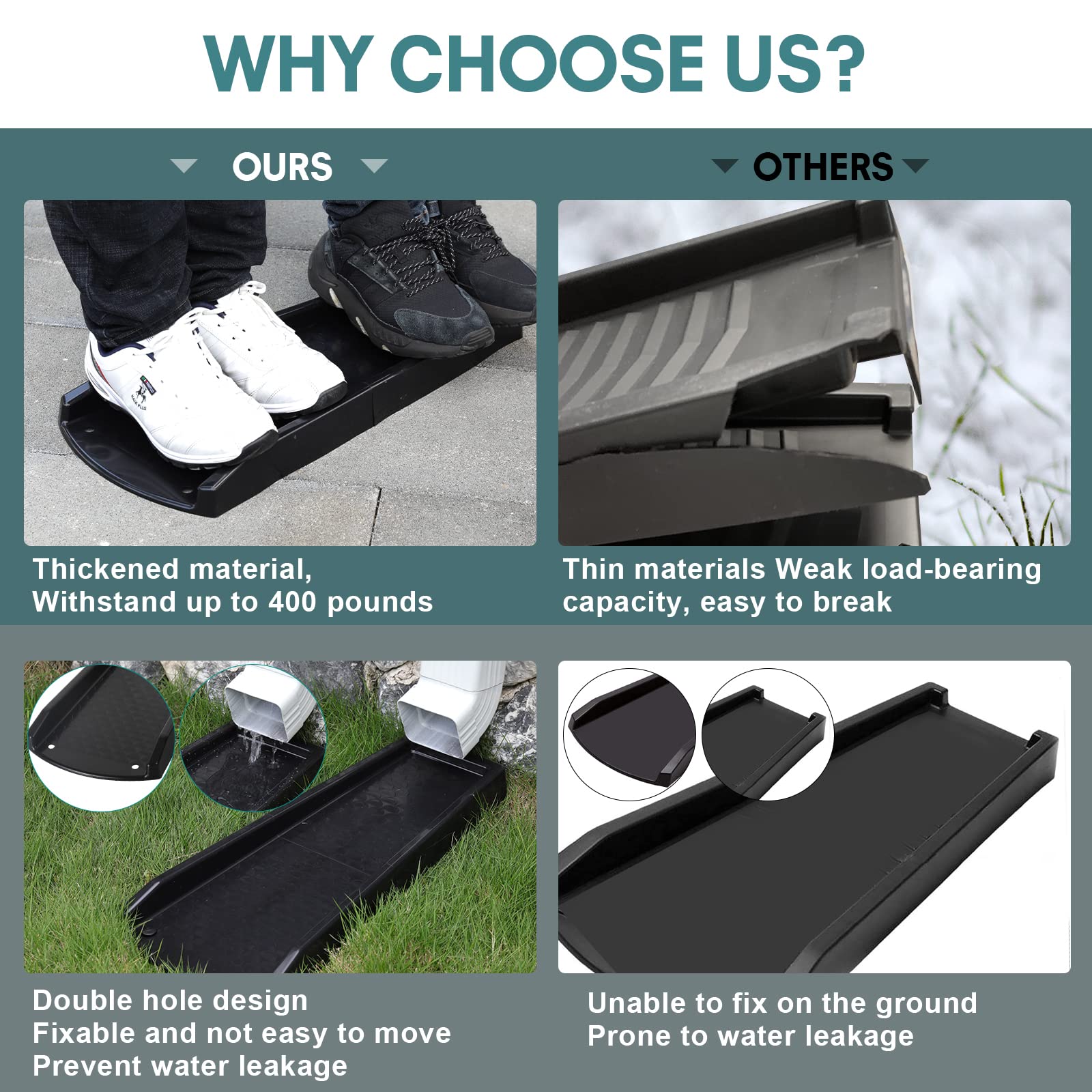 • 【 UPGRADED VERSION 】: Unlike other on the market, this gutter downspout splash block is an upgraded version, made of thickened PE material. Its biggest advantage is strong and sturdy. It will not deform or crack even in harsh weather (such as snowy). And it can withstand up to 400 pounds