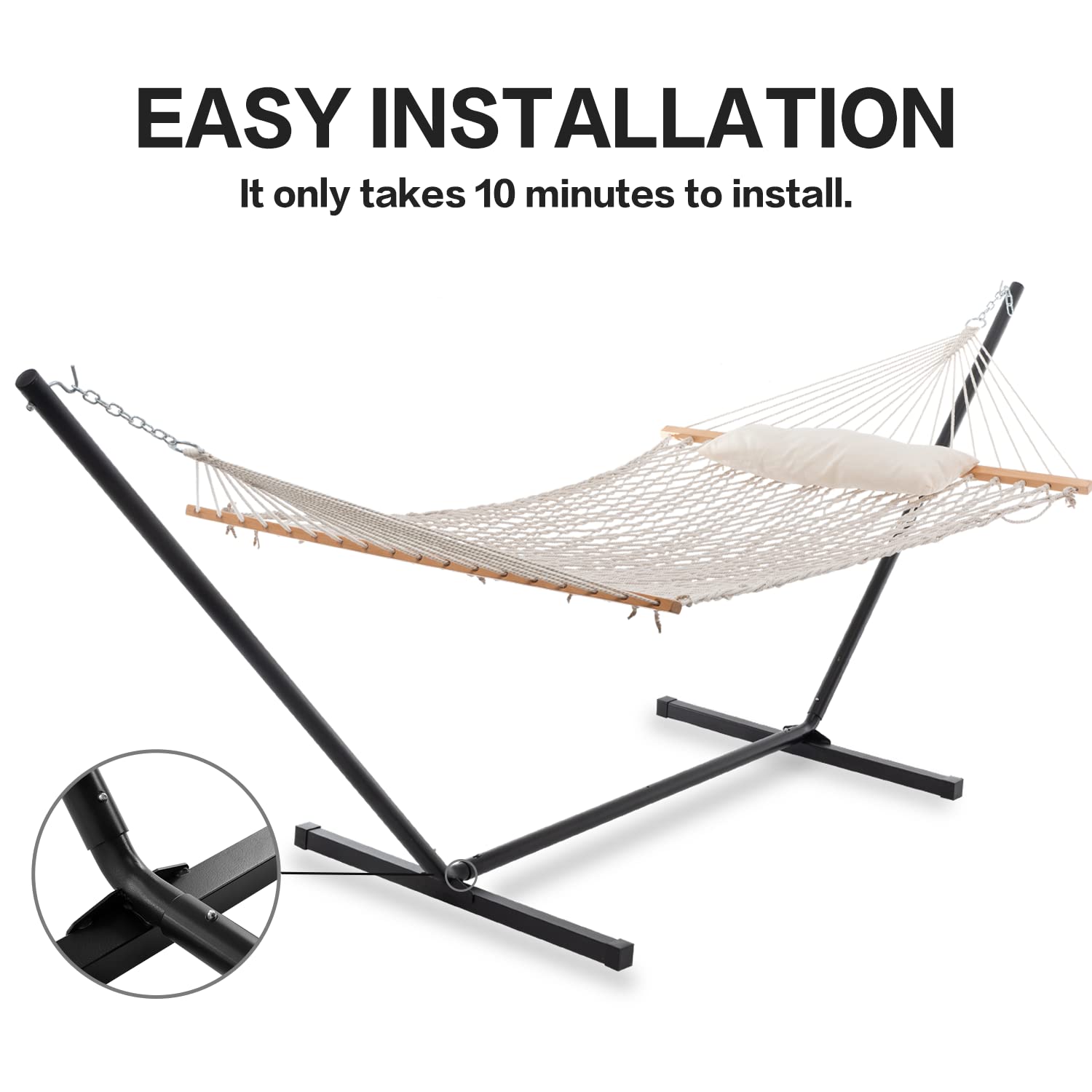 PNAEUT Double Rope Hammock with Stand Included, 12ft Heavy Duty Stand, 2 Person Traditional Cotton Rope Hammocks with Pillow for Outside Porch Patio Backyard Outdoor, Max 475lbs Capacity (Burlywood)