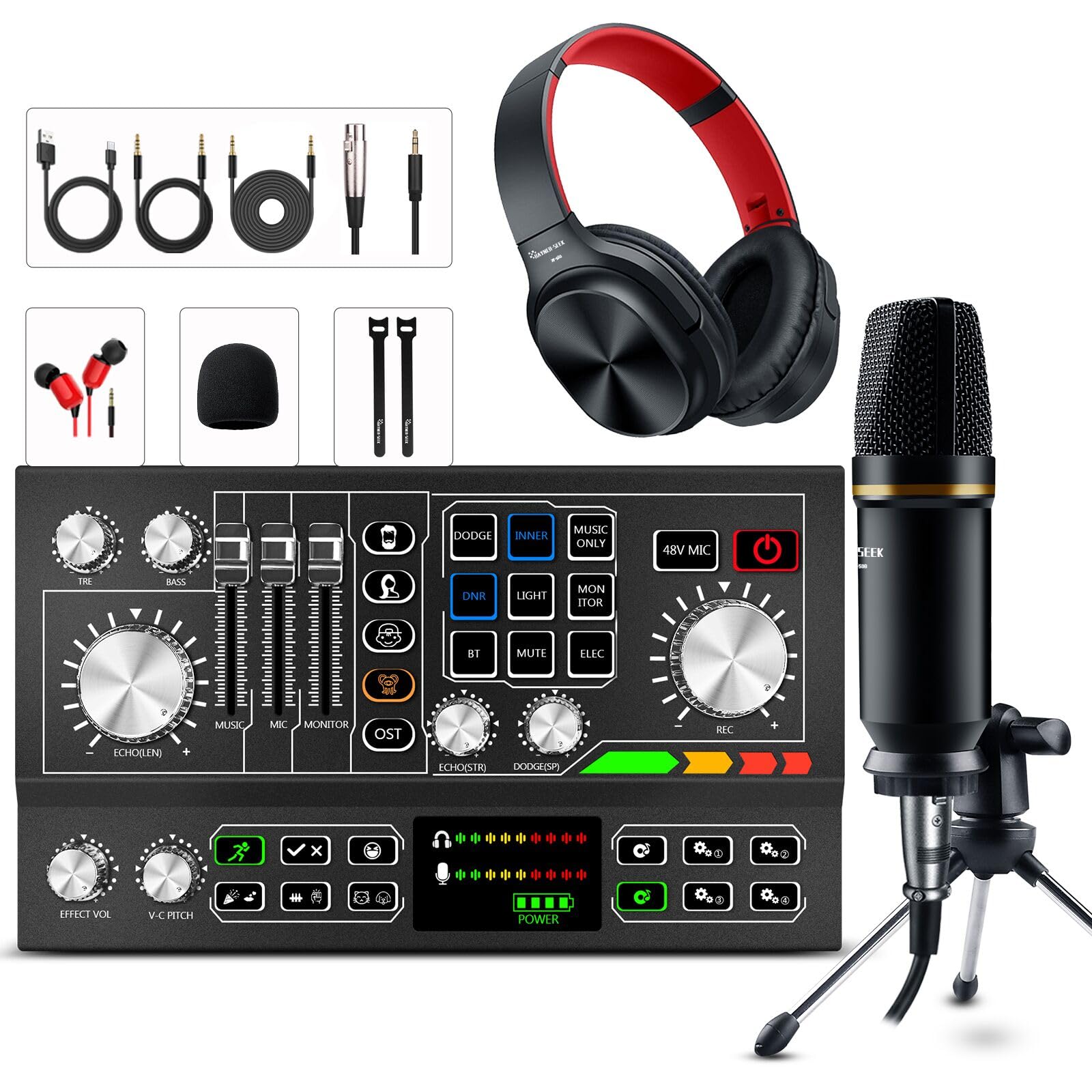 Podcast Equipment Bundle Aluminum Alloy Panel with Studio Condenser Microphone Sound DJ Mixer Broadcast Audio Interface DIY Sound Effect For PC Laptop Phone,Streaming Recording, Black