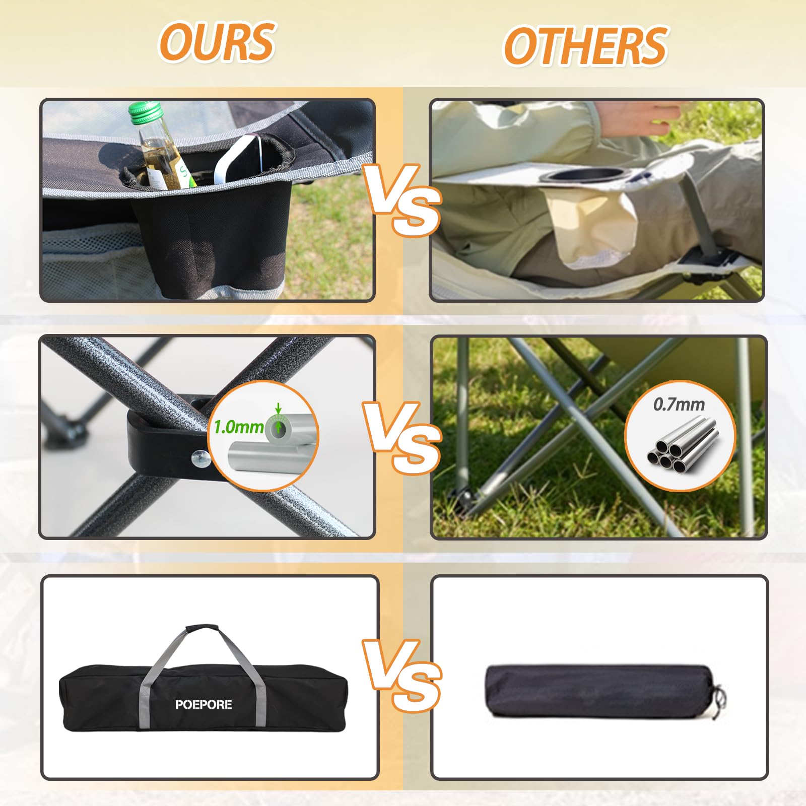 • Sturdy: The camping chair features a sturdy stainless steel frame that can support up to 264 pounds, using wear-resistant fabric and breathable mesh material to ensure your body stays cool and comfortable
