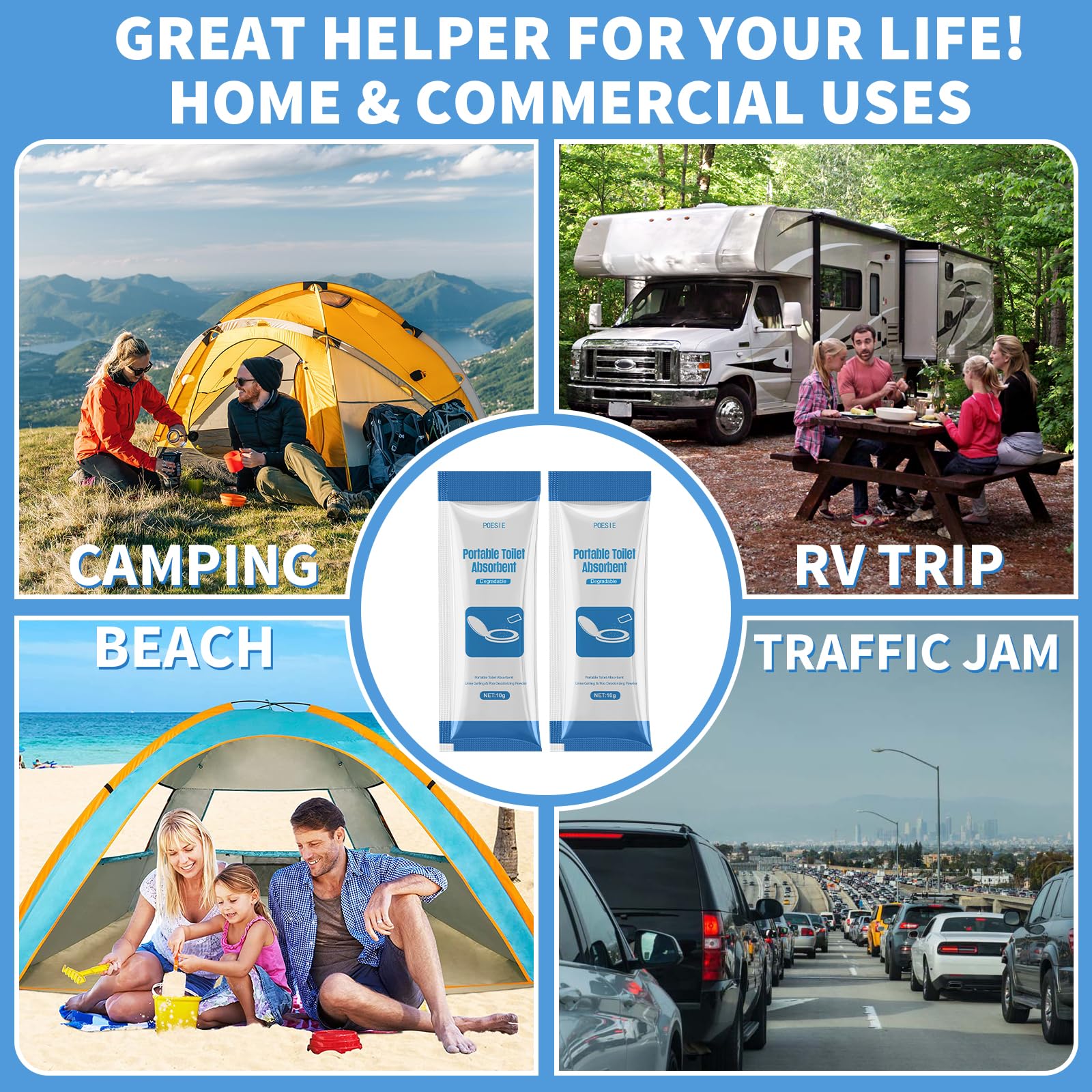 • Occasion for Poo Absorbent Powder - Camping, RV Trip, Beach, Hiking, Homecare, School, Hospital, Animal-care, Emergency Gear, etc. Use for travel toilet, emergency toilet, camping portable toilet, lugable loo toilet, composting toilet, turbo toilet, bucket toilet, etc. Small package for your go bag, little space, lots of convenience