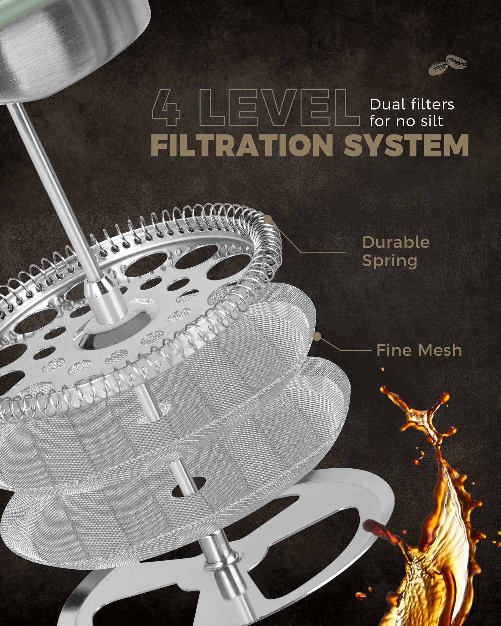 • LOOKING FOR COFFEE PRESS FOR MATCHING UP YOUR KITCHEN? We, the POLIVIAR french press coffee maker will be your smart choice. While the coffee pot is made from food grade stainless steel with stylish long-lasting coating, It is easily to match up your kitchenwares and your kitchen's theme. Also, the ergonomic handle with real wood will maximize the fantastic time of grounds you loved.