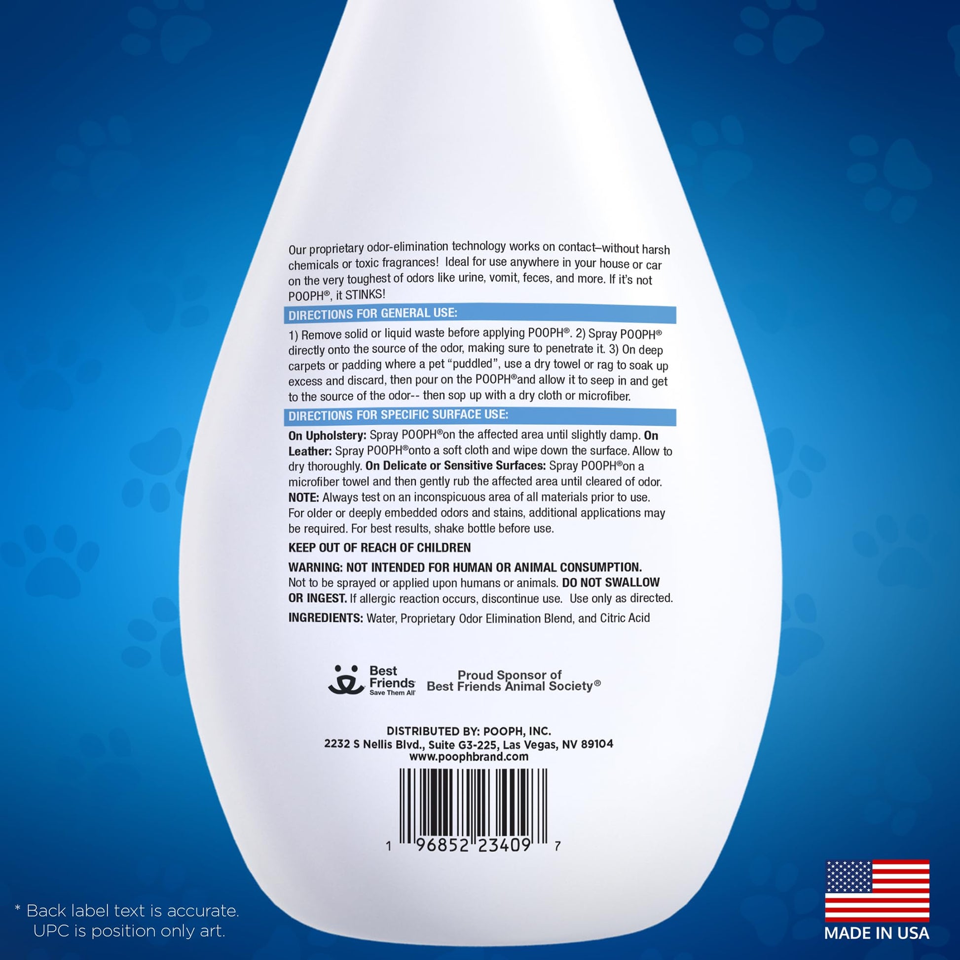 • It’s Not Water: Pooph is totally fragrance free because it eliminates odor instead of covering it up! Pooph contains no harsh chemicals—it’s a proprietary mineral-based formula so clean and pure you could actually mistake it for pure natural spring water until you actually use it and see for yourself how miraculously it works!